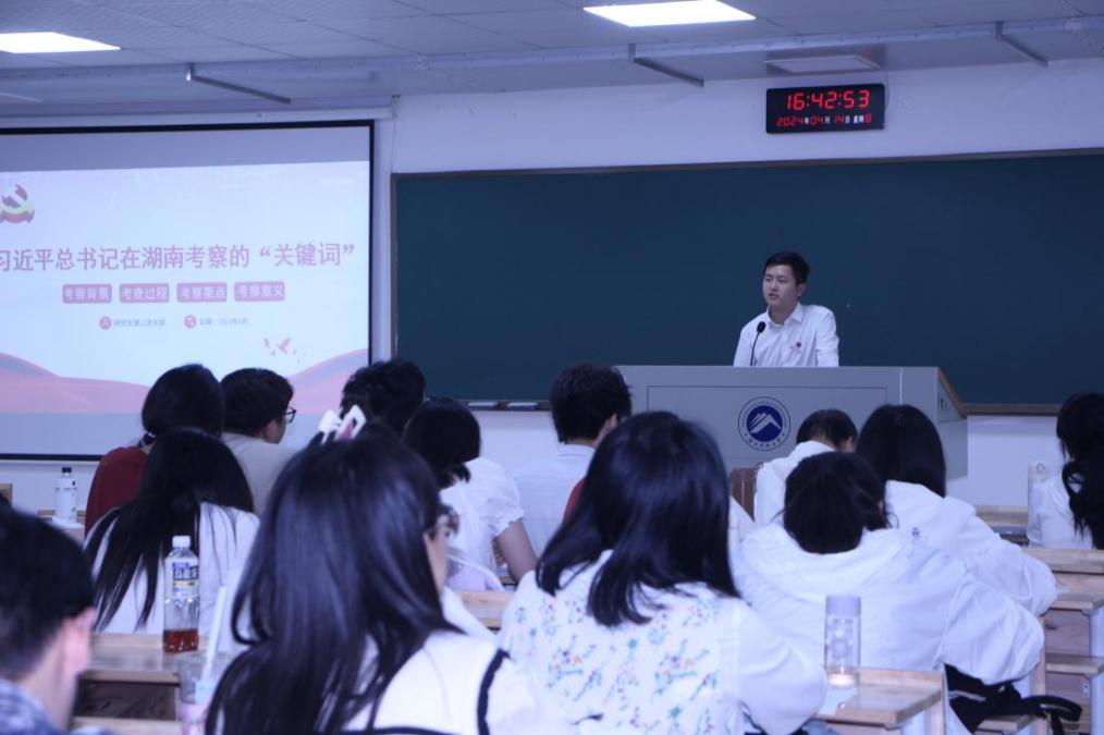 刘梓辰以“习近平总书记在湖南考察的‘关键词’”为题,结合习近平总书记在湖南的考察过程,向同学们详细阐述和解析了红色资源、粮食安全、新质生产力、基层减负、地方特色传统文化、中部崛起等六个关键词。他在宣讲中表示,作为一名中国共产党员一定要高度关注时事政治,同学们应当把个人的命运与国家和人民的命运联系在一起,立为国奉献之志,立为民服务之志,自觉把个人的理想追求融入为实现中华民族伟大复兴的中国梦的奋斗当中。