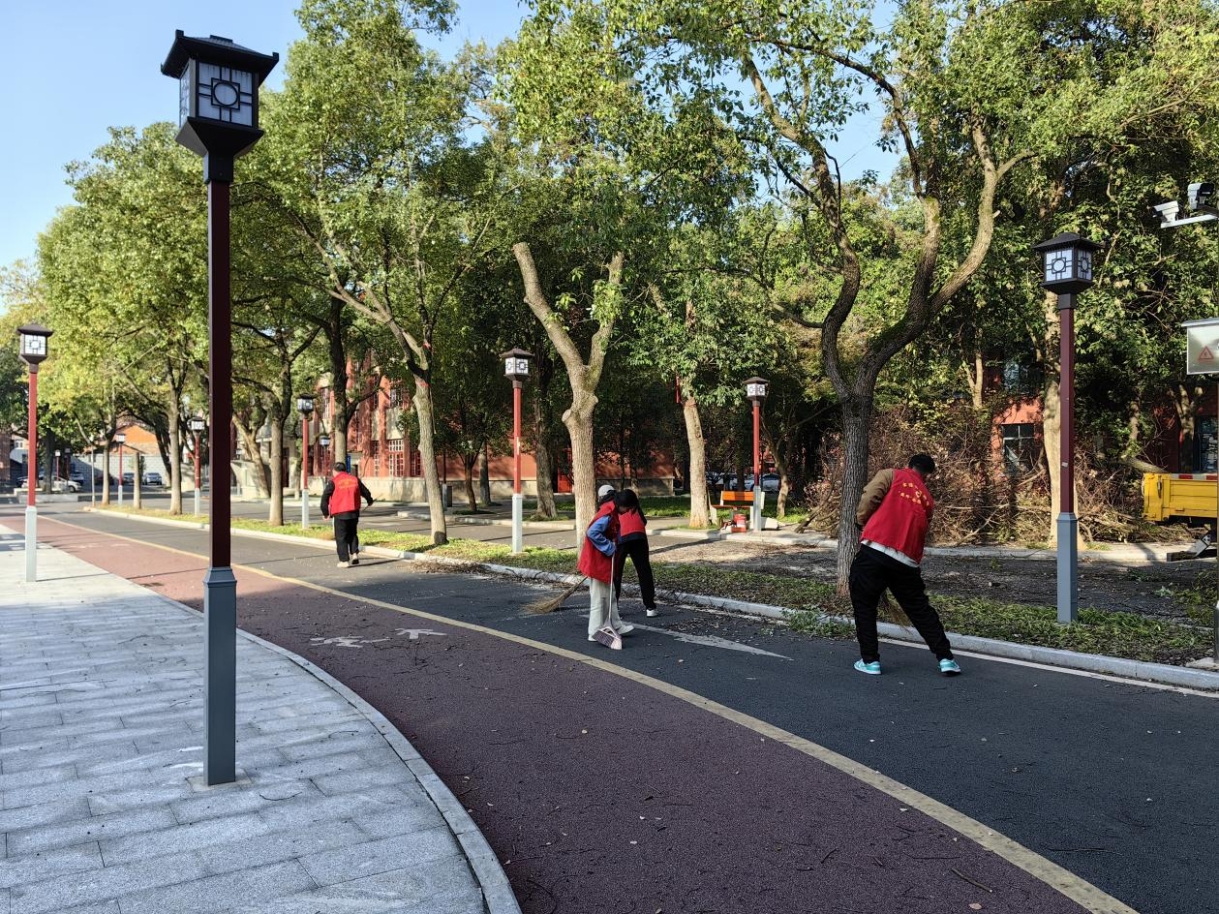 观影活动结束后,支部成员前往昭潭书院开展清扫道路的志愿服务活动。在支部成员的共同努力下,校园面貌焕然一新。清扫活动不仅营造了良好的学习环境,还有效发挥党员服务群众的作用。同时,也进一步强化了支部党员的社会责任意识和奉献精神,真正在实践中体悟初心使命。