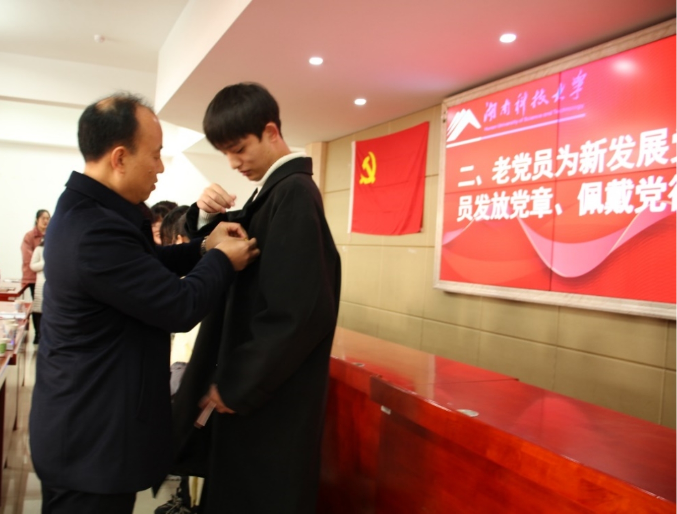 入党宣誓仪式在庄严雄壮的《国际歌》声中拉开帷幕,首先由刘图其为新党员发放《党章》,随后老党员给新发展的党员佩戴党徽。