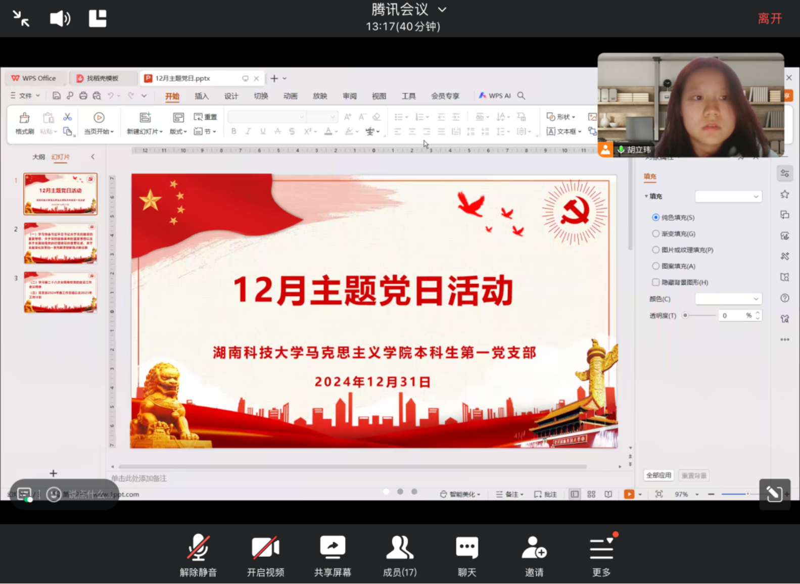研究生第五党支部鹿文琦同志分享到:身为学生党员,我们要深刻领悟贯彻习近平总书记关于高校党建工作的核心思想,持续推动党的创新理论入脑入心入行,切实发挥党员先锋模范作用。