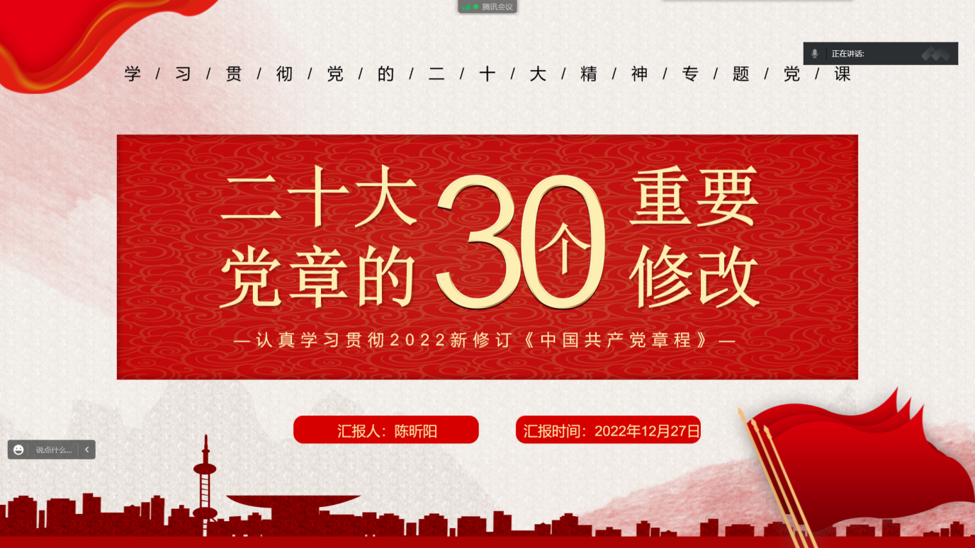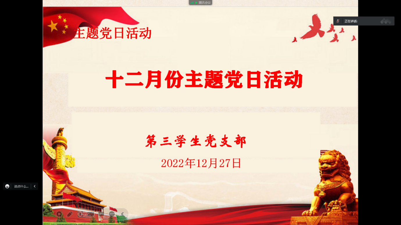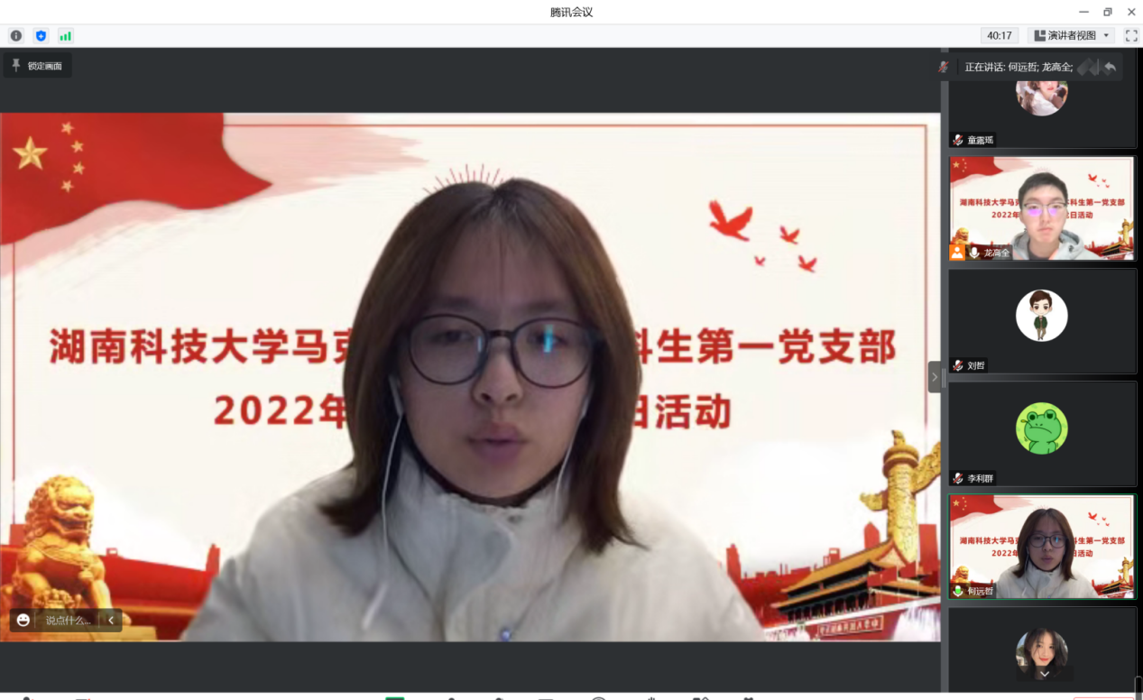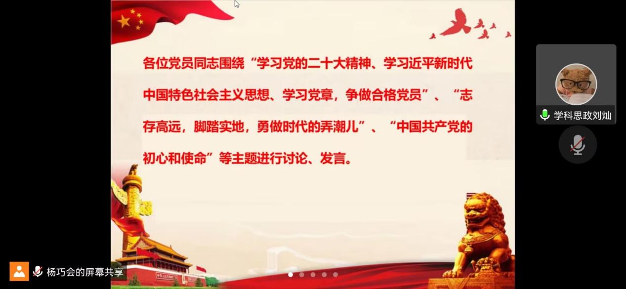 为深刻领会党的二十大精神内涵,理解党章修订的核心要义,学习优秀共产党员的先进事迹,增强青年党员的使命担当,12月27日,我院本科生第一党支部、研究生第二、三、四、五党支部及下属昭潭书院校区党小组分别召开“一课一片一实践”系列活动暨12月主题党日活动。鉴于疫情防控需要,此次活动采取线上方式进行,各学生党支部全体党员参会。