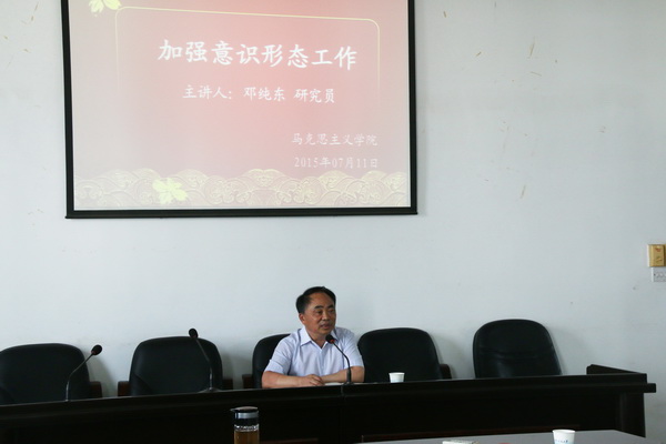 ——加强意识形态工作 7月11日下午,中国社科院马研院院长邓纯东研究员应邀在我院十教506学术报告厅做了一场题为“加强意识形态工作”的精彩学术报告。永利yl23411院长徐德刚教授主持了本场报告会,学工处处长李红革教授、副处长莫江平副教授及我校部分学院副书记、学工办主任及永利yl23411师生在场聆听。