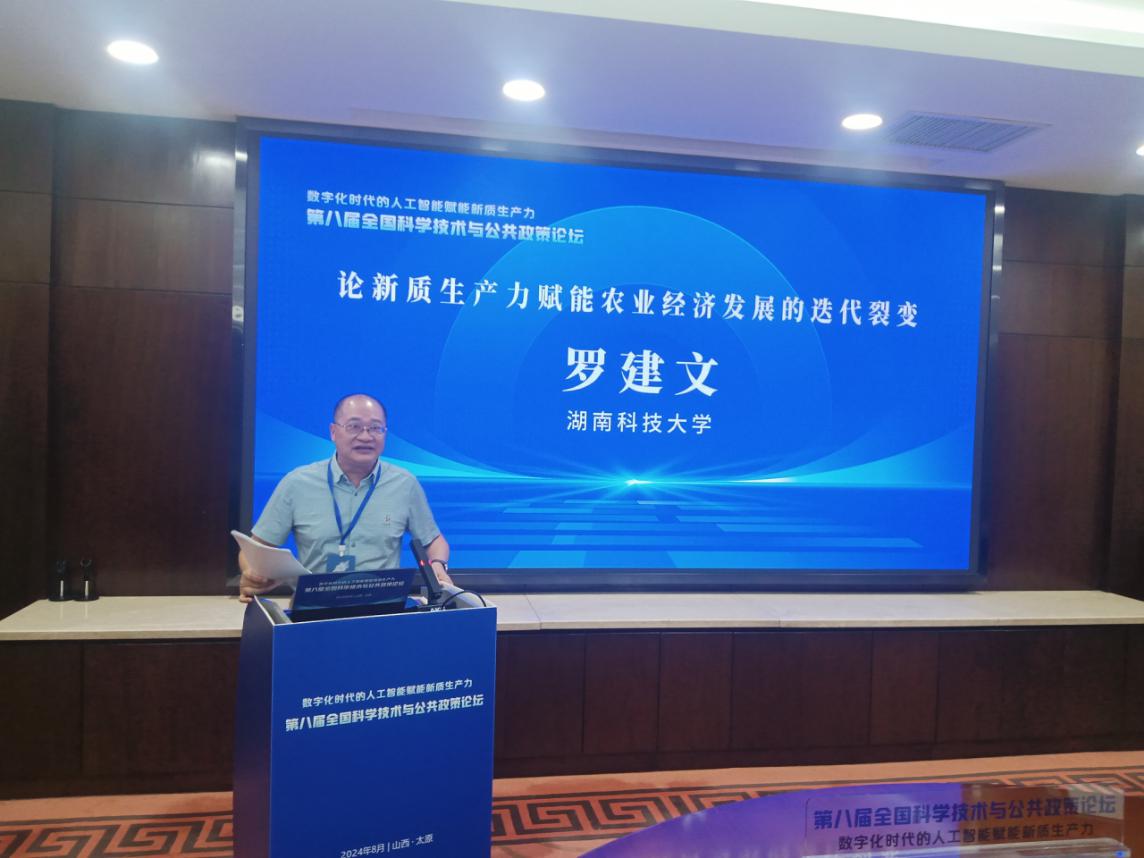 我院博士生导师罗建文教授在大会上作了《新质生产力赋能农业经济发展的迭代裂变》的专题报告。罗教授指出,培育和发展新质生产力在推动农业经济高质量发展、推进农业农村现代化和农村共同富裕中的迭代裂变具有重要的战略意义和深远的价值意蕴。大量科技成果嵌入农村生产生活各环节,农业新质生产力成为引领中国农村产业经济高质量发展的战略引擎,必须为农业新质生产力变成发展新动能而“建立新秩序”。必须充分利用农业新质生产力在推动农业经济高质量发展进程中的迭代效应,增强农业经济发展的内生发展动力,推动农业新质生产力转化为农业农村现代化发展的新动能和新赛道,为中国式现代化作出更大贡献。罗建文教授的大会发言受到与会学者的高度关注和积极评价,并就发展农业新质生产力的价值、如何促进农业经济高质量发展、如何培育农业新质生产力等问题展开了讨论。