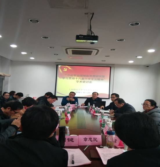 2016年11月25-26日,在上海财经大学召开“习近平治国理政思想研究暨学习贯彻十八届六中全会精神”学术研讨会。应主办单位上海财经大学的邀请,复旦大学、上海交通大学、华东师范大学、中山大学、湖南科技大学、西南财经大学、上海大学等20多所高校全国马克思主义理论学科的学者和学术理论期刊的代表40多人参加了会议。与会代表围绕“中国化马克思主义新思想新观点新论断新发展”、“习近平治国理政思想对中国特色社会主义理论体系的主要贡献”、“习近平治国理政思想的整体性研究”、“习近平治国理政思想的哲学智慧”、“习近平治国理政思想与中国方案”、“习近平治国理政思想与从严治党”等问题进行了广泛而热烈的讨论,彰显出学者们追求真理的睿智和爱党爱国的情怀。
