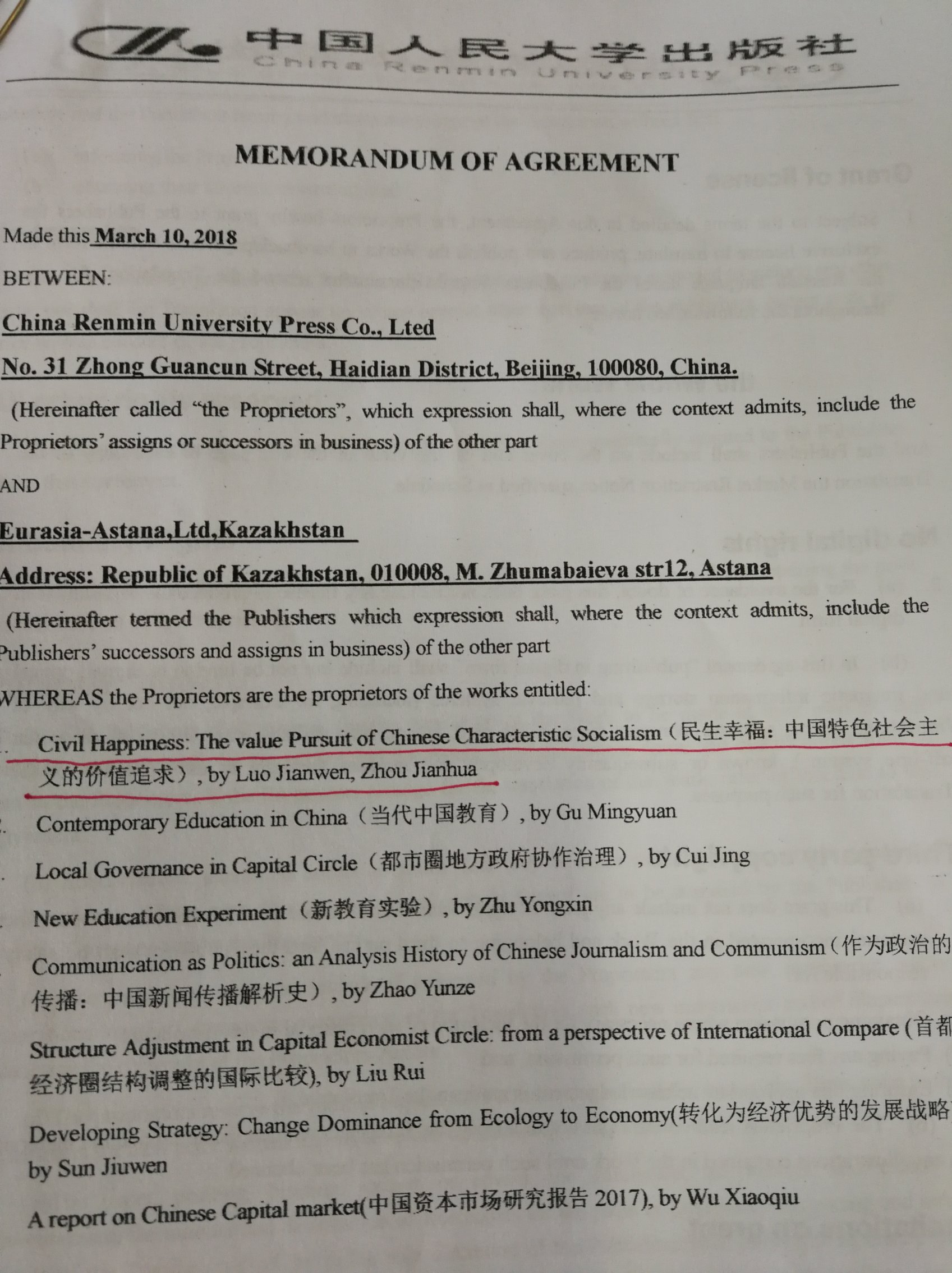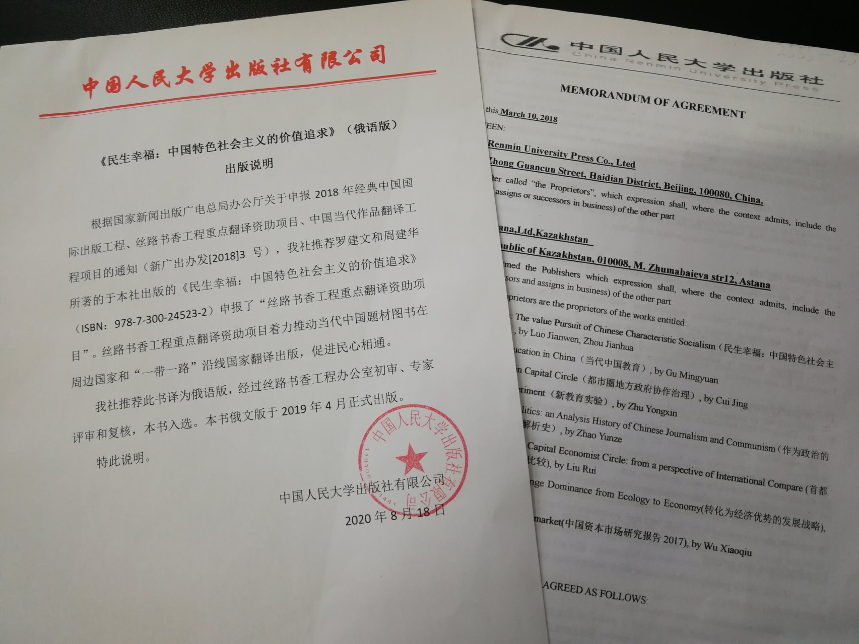 中国人民大学出版社有限公司2018年一共成功申报并获得立项资助了8本著作,与外方出版公司签署了翻译出版合同,作为《2018年丝路书香工程重点翻译资助项目》俄文版正式出版,并在周边国家和“一带一路”沿线国家正是发行。罗建文教授和周建华老师的著作《民生幸福:中国特色社会主义的价值追求》被列在与外方出版合同的第一项。