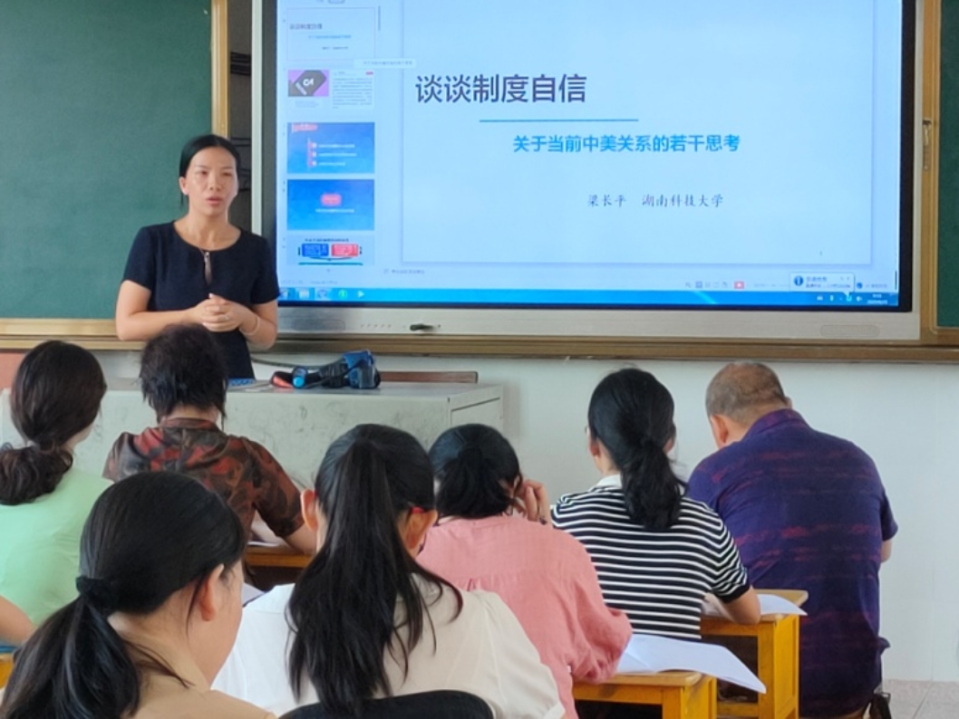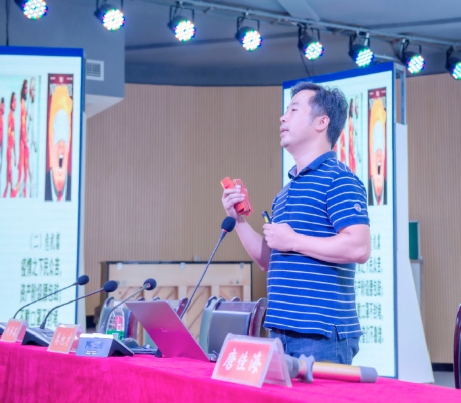 梁长平博士以《谈谈制度自信——关于当前中美关系的若干思考》为题,从最近美国政府封杀社交媒体Tiktok这一案例说起,讲述了中美关系发展的历史演变、美国政府对华政策的新变化及其原因以及中美关系的未来发展等问题,阐明了增强中国特色社会主义制度自信、道路自信的重要性和策略方法。彭立春博士以《把挫折变“存折”——兼论情绪管理的智慧》为题,引用了大量习近平总书记关于理想信念、中国精神的金句名言,从如何认识挫折、为什么要把挫折变为“存折”以及如何把挫折变为“存折”等三个方面介绍了教师加强情绪管理的智慧方法,包括增强奋斗精神和抗挫折能力,保持积极向上、乐观豁达的精神风貌,提升自信心和幸福感的具体路径。唐佳海博士表演了系列自编快板《道·德·风》,伴随着轻快的快板声,以郎朗上口的语言分享了对正道、大德和新风的认识和看法,特别是阐释了社会主义道德“为人民服务”这一核心以及集体主义原则等重要概念及践行方法。