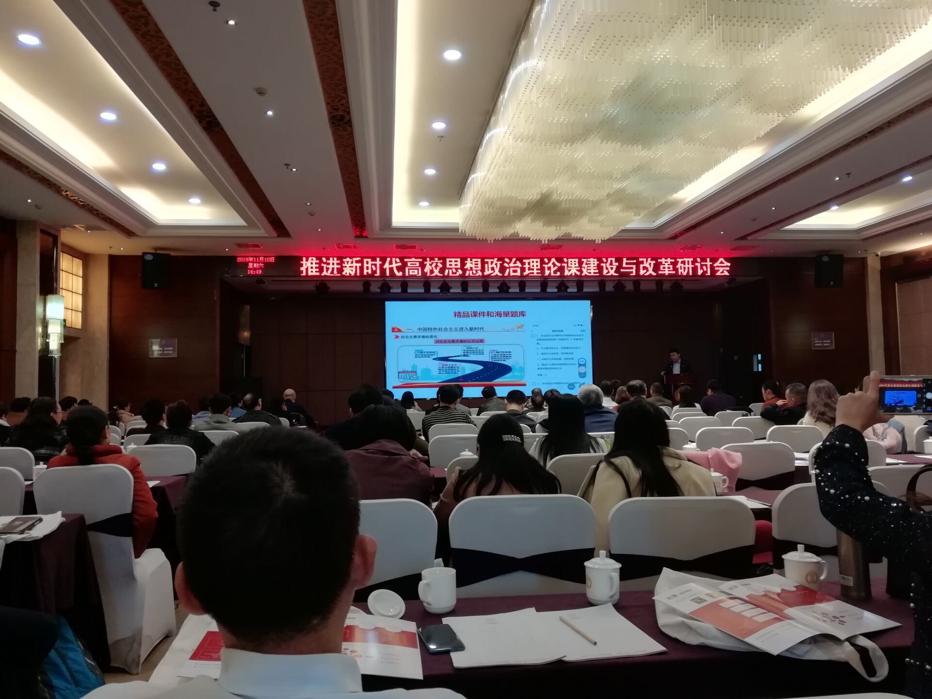 为深入贯彻落实习近平新时代中国特色社会主义思想和党的十九大报告精神,更好地推动习近平新时代中国特色社会主义思想和党的十九大报告精神进教材、进课堂、进学生头脑,总结经验,分享成果,共同发展。中南大学联合湖南世纪超星信息技术有限公司于11月10日在长沙召开“推进新时代高校思想政治理论课建设与改革研讨会”。来自湖南省数十所高校思想政治理论课教师代表参加了此次会议。我院刘让新副教授、李爱军博士、韩平博士、蔺宏涛博士、钟声博士、管桂翠博士、周文斌博士、王霞博士、杨大容等9位教师参加了此次研讨会。