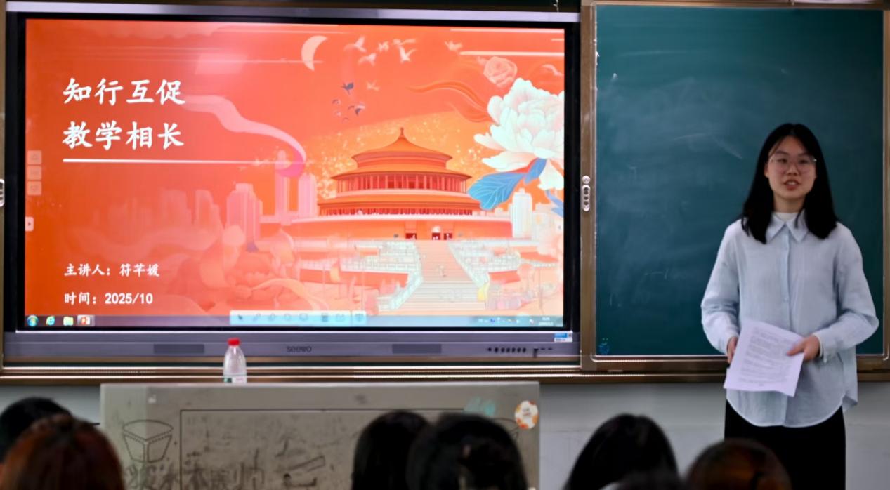 符芊媛老师以“学姐”的身份亲切开讲,迅速拉近了与在场实习老师的距离。她结合自身实习经历,从听课、上课与评课、班级管理、社会实践四个维度,娓娓道来她的收获与感悟。她谈到,一名优秀的教师,绝不能止步于知识的传授,更要成为课堂氛围的营造者和学生思维的引导者。而对于思政教师而言,肩上的责任更重——我们不仅是马克思主义理论的传播者,更是学生理想信念的引领者和思想成长的陪伴者。她鼓励实习教师们,要主动在听课中汲取智慧,在课堂上磨炼技能,在管理中提升能力,在实践中深化认知,真正体会“教学相长”的深刻内涵。