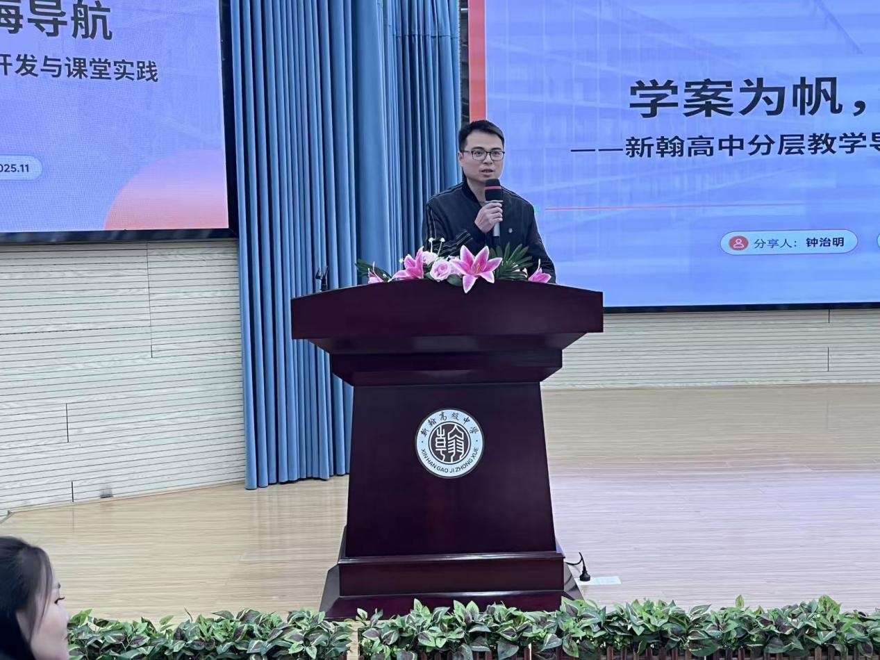 其次,钟治明老师以《学案为帆,瀚海导航》为主题,结合高一数学学科特点,介绍了高一数学组在分层导学案开发与应用方面的成功实践。他表示,高一数学组深入落实“分层设计、动态调整”策略,践行“以学生为中心,以导学案为路径”的理念,通过“集体定标、个人精备、集体优化、复盘修订”的“四步法”实践,设计个性化学习路径与合作任务,致力于激发各层次学生的学习潜能,实现数学学科素养的全面提升。