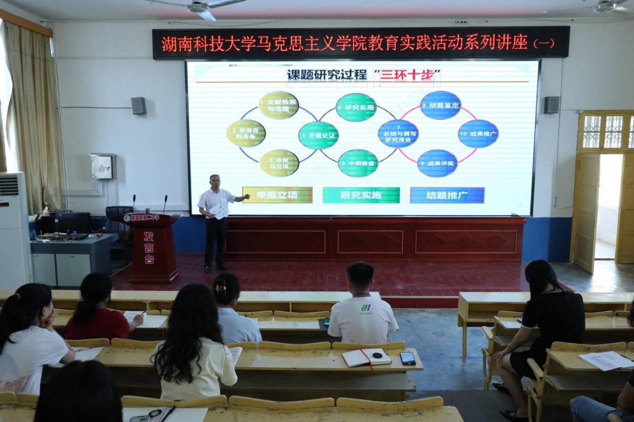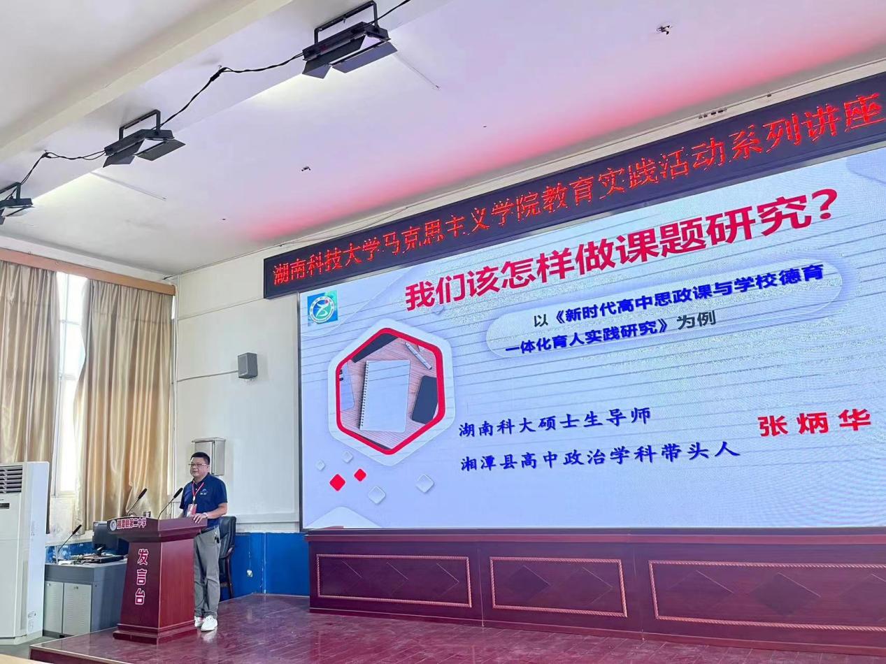 提升教师的教育科研能力、专业化素养,是扎实推动教育强国建设的题中之义。9月20日上午,湖南科技大学永利yl23411“思政大讲堂”第11期暨“大中小学思政课一体化建设”系列讲座第1讲,以“我们该怎样做课题研究?——以省教育科学规划课题《新时代高中思政课与学校德育一体化育人实践研究》为例”为主题,在湘潭县二中精彩开讲。本次讲堂由湖南科大硕士生导师、湘潭县高中政治学科带头人张炳华老师主讲,湖南科大马院实习带队教师李育军博士主持。湖南科大全体实习教师、湘潭县二中思政教研组全体成员及部分教师参加。