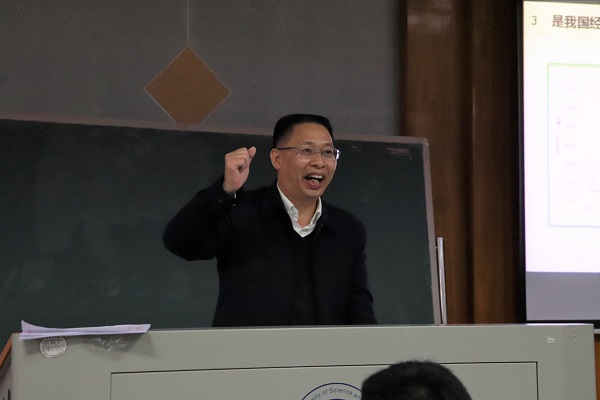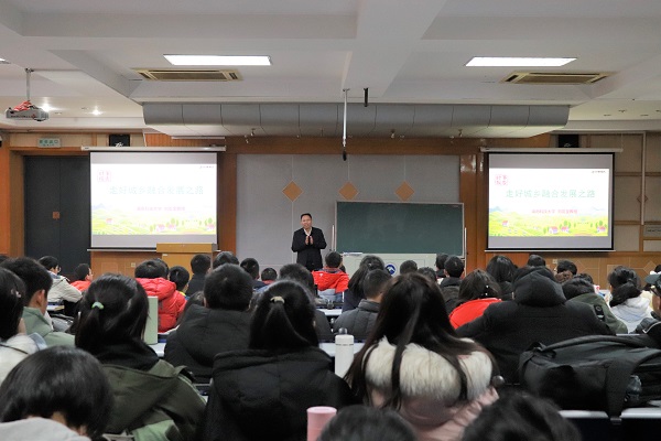 在正式上课之前,刘友金教授结合同学们的专业,对他们课前点到方式提出了自己的见解。刘友金教授建议同学们平时养成勤于思考的好习惯,才能成为优秀的人才。刘友金教授的这节课围绕四个问题展开。首先,他给同学们讲了第一个问题,“充分认识城乡融合发展的重要意义”:是实现乡村振兴,实现两个一百年,奋斗目标的必然要求;既是现代化的抓手,也是重要标志;是我国经济进入新阶段的客观要求;也是尊重乡村发展规律,认识乡村价值的必然结果。谈到第二个问题“城乡融合发展历程及成效”时,刘友金教授从土地政策,水电路网基础设施,城乡一体的基本公共服务,城乡差距在缩小等方面进行了详细论述。接下来第三个问题“正确认识城乡发展不平衡现状”,他指出:城市市场可以灵活迅速、调整,而农村市场却不行。比如,今年猪肉上涨问题,猪从它开始养殖到市场上售卖,需要经历一个较长的时间,导致不能在一个较短的时间内调整好。农业生产存在着众多弊端,需要我们从经营方式等方面找到解决方法。谈到最后一个问题“城乡融合发展新线路图”时,刘友金教授指出,一个国家是否发展,关键是要看两方面:一方面是看高科技技术产品;另一方面是看农村发展状况。最后总结到,乡村发展好的地方,这三个方面一定发展的好:一党组织强,二集体经济发展好,三乡村治理好。刘友金教授在课堂上举了很多例子,将深刻的道理以通俗的方式,深入浅出给同学们讲明白了,同学们都受益良多。