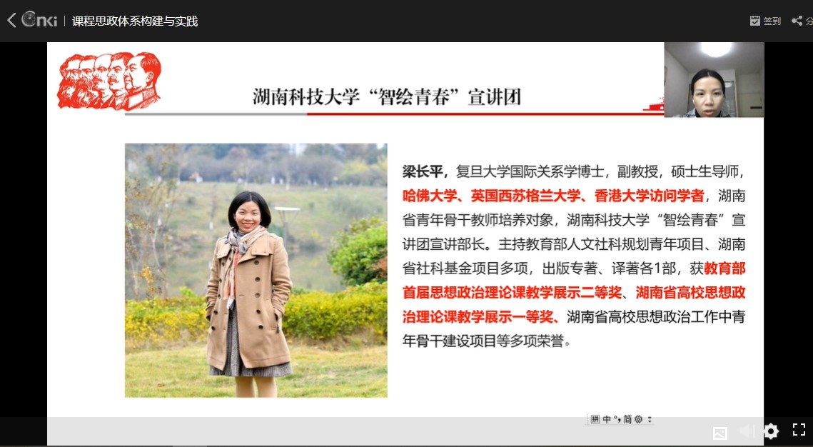 由湖南省教育厅主办、湖南省教育科学研究院承办的“2021年湖南省职业院校教师素质提高计划——骨干教师教学能力提升高级研修班”1月24日举行,受主办方邀请,我校永利yl23411教师、“智绘青春”宣讲团成员梁长平老师给全省职业院校近百名骨干教师做了一场“三全育人背景下的课程思政体系建构与实践”的线上专题讲座。