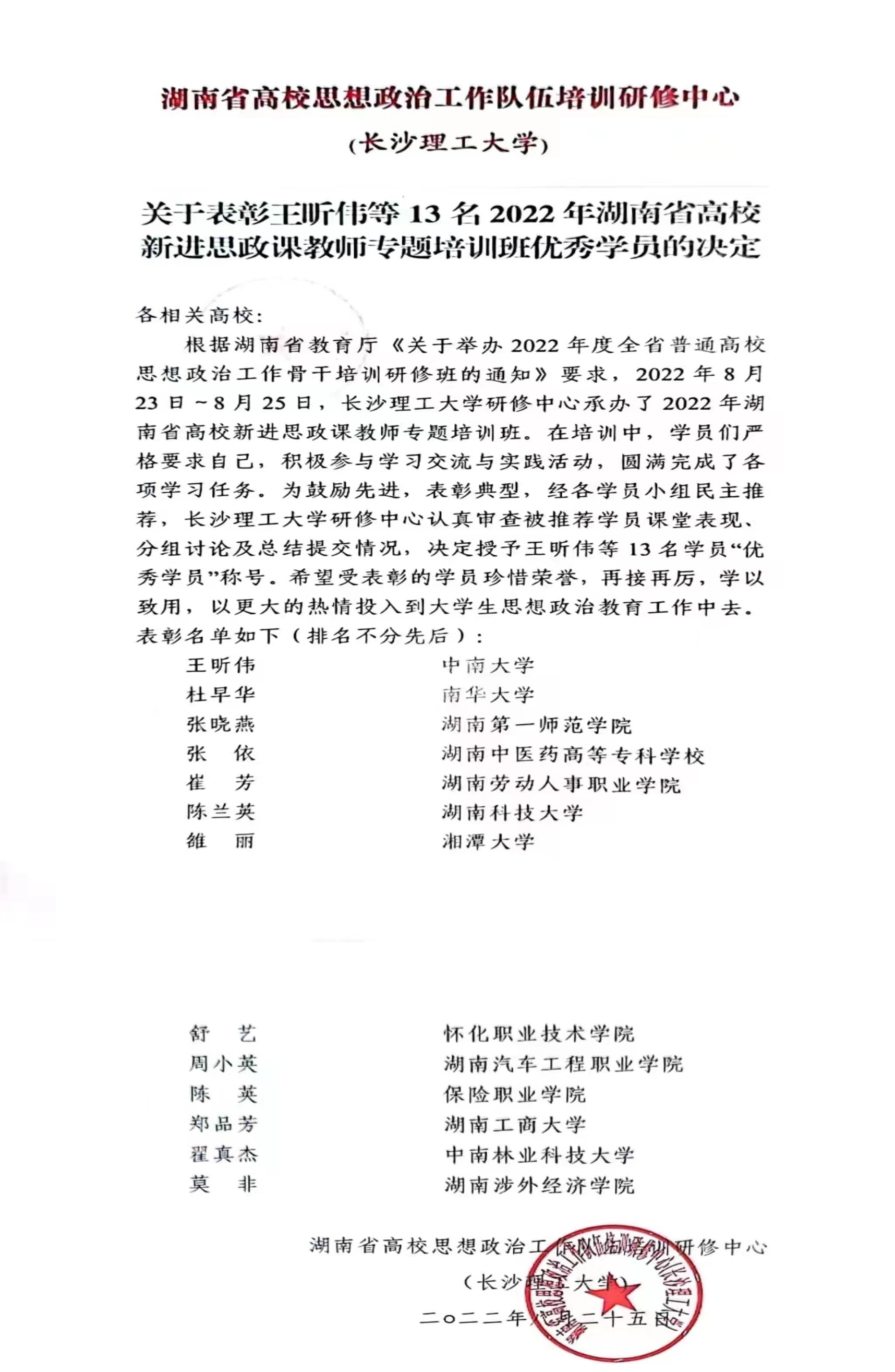 8月23-25日,2022年湖南省高校新进思政课教师专题培训班在长沙理工大学举行。本次培训班由湖南省委教育工委、省教育厅主办,长沙理工大学承办。来自全省各大高校的98名新入职思政课教师参加了此次培训。我院陈兰英博士参加了此次培训班,担任第三组组长并获得了优秀学员的荣誉称号。