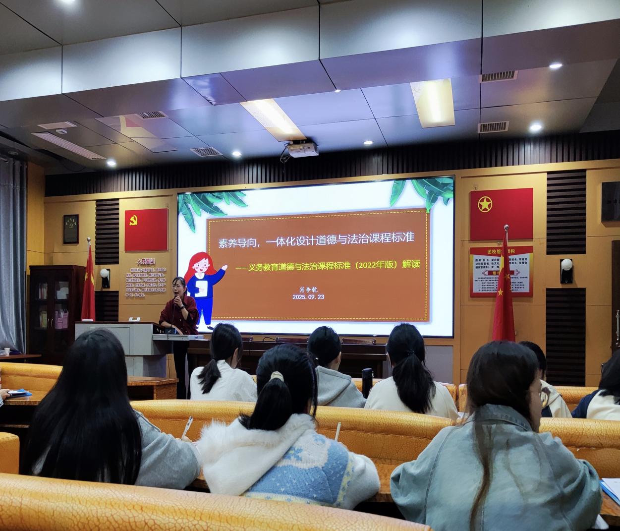 9月23日上午,“思政大讲堂”第46期在湘潭江声实验学校实验楼会议室举行。本次讲座以“《道德与法治课程标准》解读”为主题,由湘潭江声实验学校肖争乾老师主讲。2022级思政专业江声实习队全体成员参加了此次讲座。