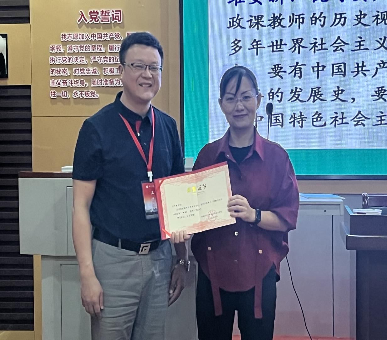 实习队员们全神贯注地听课,认真细致地做好记录。课程结束后,带队教师李育军博士为肖争乾老师颁发了荣誉证书,随后,大家与肖老师一起合影留念,记录下这难忘的时刻。实习队员们纷纷表示,肖争乾老师深入浅出的课标解读,为他们后续开展教学实习工作提供了清晰的指引和有力的支持。在今后的教学实践中,他们将积极把所学内容转化为实际教学能力,努力设计出既符合素养导向又贴合学生需求的道德与法治课程,为培养新时代的优秀学生贡献自己的力量。
