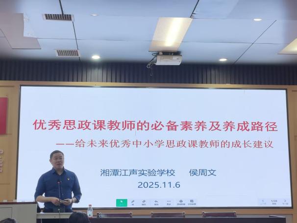 11月6日下午,湘潭江声实验学校副校长侯周文主讲了一场题为《优秀思政课教师的必备素养及养成路径——给未来优秀中小学思政课教师的成长建议》的专题讲座,旨在助力湖南科技大学实习教师明确职业成长方向、夯实专业素养根基。讲座由该校鄢国庆主任主持,湖南科技大学2022级思想政治教育专业江声实习队带队老师李育军博士及全体队员参加。