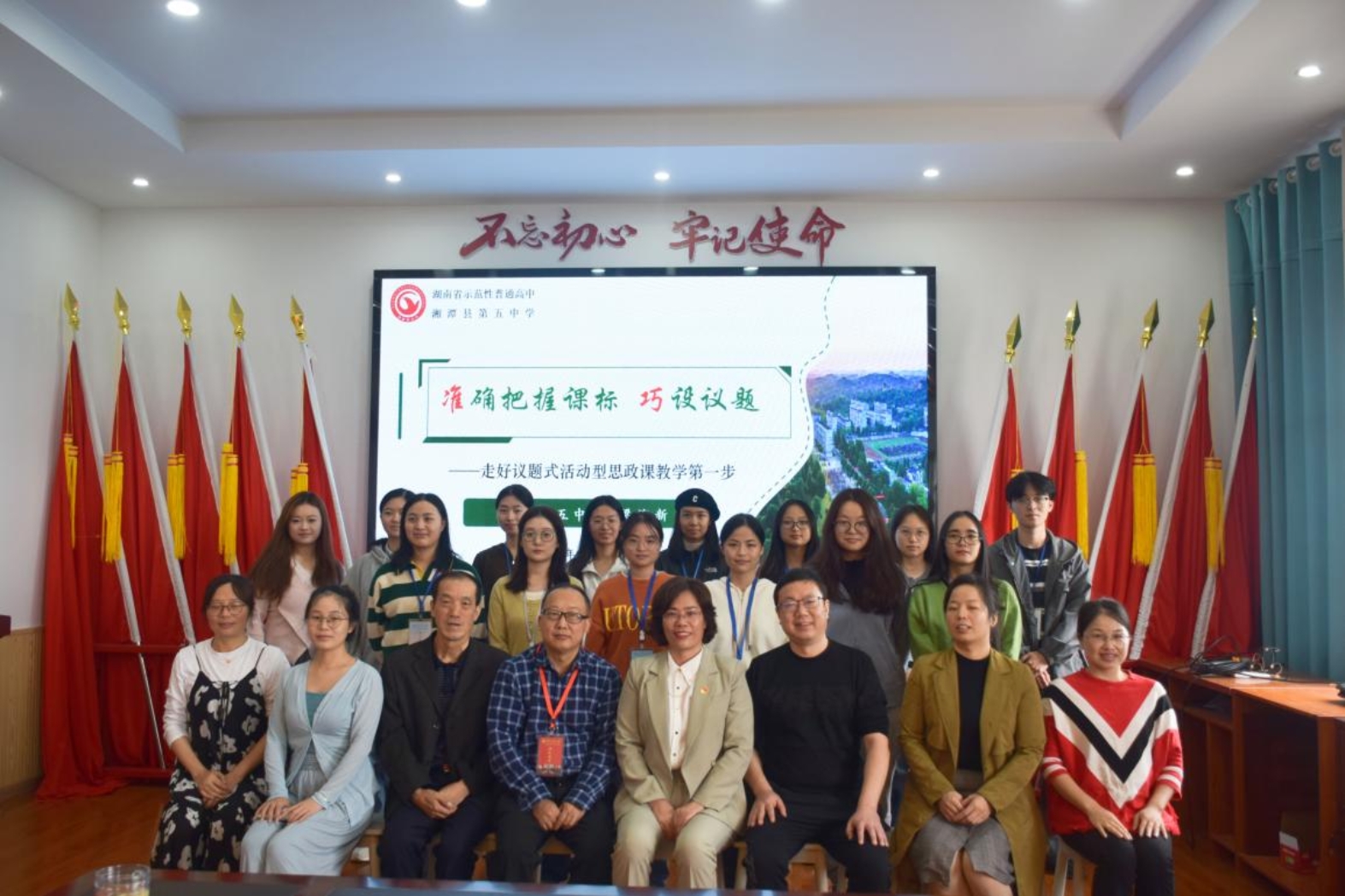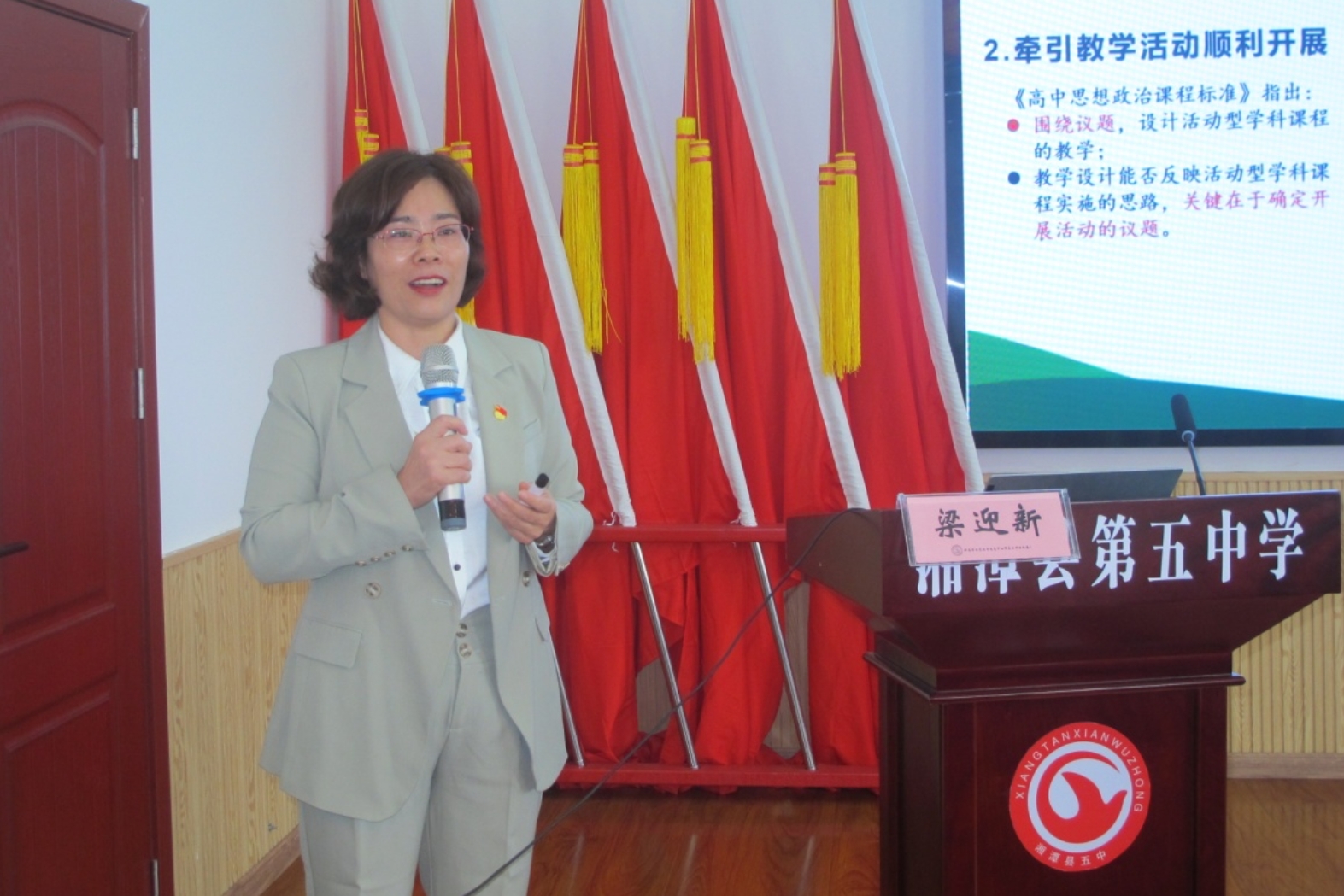 《普通高中思想政治课程标准》(2017年版 2020年修订)在教学实施建议中指出:要围绕议题,设计活动型学科课程的教学。为提高思政课老师把握新课标、设计议题的能力,10月12日上午,湖南科技大学教育硕士实践型导师、湘潭县第五中学梁迎新校长作了“准确把握课标,巧设议题——走好议题式活动型思政课第一步”的专题讲座。讲座由湘潭县第五中学任见副校长主持,湘潭县五中陈亮副校长及思政课老师、湖南科大永利yl23411实习队全体成员聆听了梁校长的讲座。这也是永利yl23411“思政大讲堂”第13期暨“大中小学思政课一体化建设”系列讲座的第2讲。