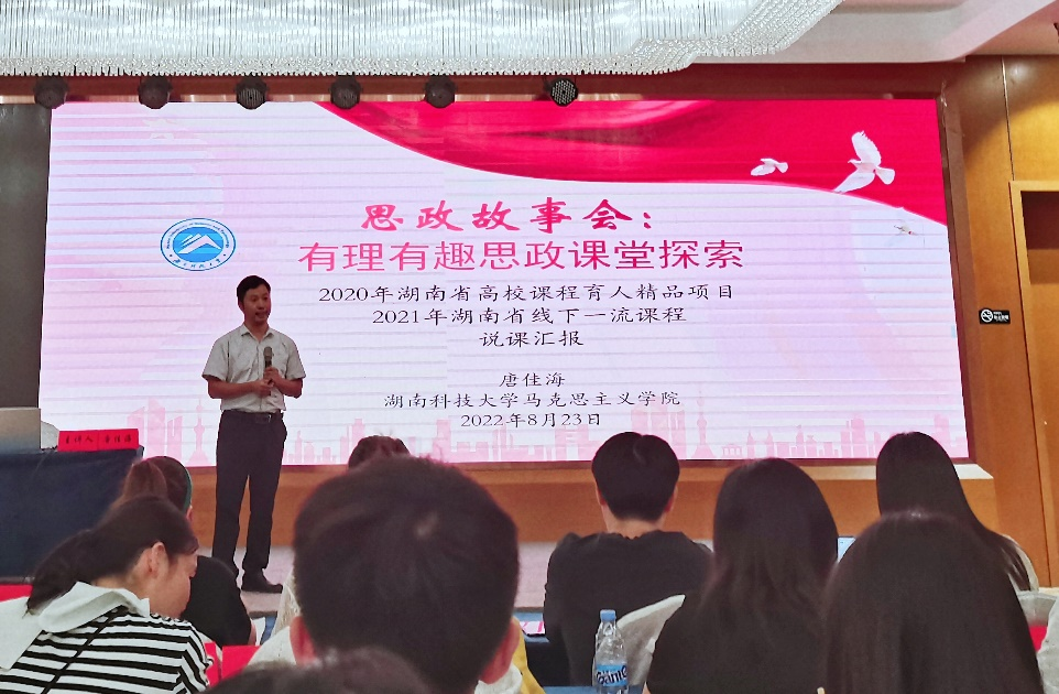 在为期4天的培训中,来自省内各高校的刘建平、李正军、杨小军、艾楚君、曹清燕等教授就如何利用红色文化讲好思政故事、新时代讲好思政课的典范和遵循、思政课教师如何做好科研、思政课教师价值观引导误区及矫正等方面进行了专题讲解。培训班还设置了优秀说课、示范课展示。来自湖南师范大学、湘潭大学的丁峰、熊慧博士进行了《解读伟大的建党精神,赓续百年红色基因》《中国精神的丰富内涵》,以及《青年毛泽东怎么读书》的优秀说课、示范课展示。我院唐佳海博士分享了湖南省高校课程育人精品项目和省线下一流课程《思政故事会:有理有趣思政课堂探索》。