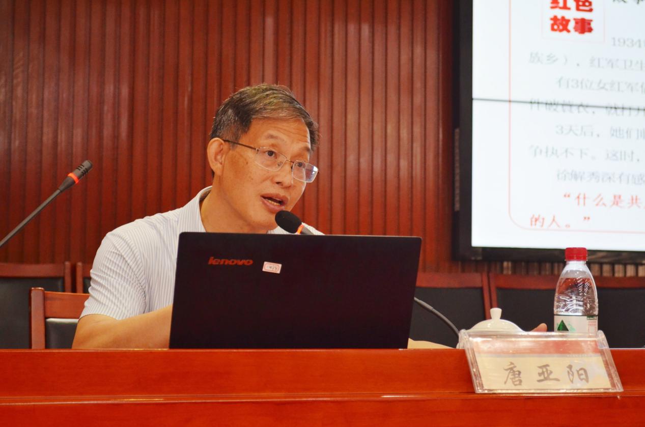 接下来,围绕“从湖湘红色基因中汲取砥砺奋进的精神力量”这一讲课主题,唐书记结合习近平总书记在党史学习教育动员大会上的讲话指出:牢记初心使命、坚定信仰信念、推进党的自我革命是党史学习教育的意义所在,我们要牢记学史明理、学史增信、学史明德、学史力行的总目标和学党史、讲思想、办实事、开新局的总体要求。随后,他还对习近平总书记提出的关于党史的“三个重大意义”、“四个实践要求”、“六个学习教育重点”与“九个精辟论述”作了进一步阐释。对于“为什么说湖南是一方红色热土”这个问题,唐亚阳分别从发出“建党先声”、成为“建军摇篮”、开创“建政先河”三个方面进行解答。“湖湘红色基因具体是什么”,唐亚阳通过故事分享,缅怀英烈,重温历史,从六个方面进行解答:一是弘扬矢志不渝,坚定理想信念;二是弘扬爱国为民精神,践行初心使命;三是弘扬勇于斗争精神,扛稳责任担当;四是弘扬敢为人先精神,奋发开拓进取;五是弘扬不怕牺牲精神,强化无私奉献;六是弘扬实事求是精神,秉持求真务实。他还对湖湘红色基因的突破发展提出独到见解:要全面发掘湖湘红色文化资源,解码、激活湖湘红色基因,充分利用红色文化“富矿”;要不忘初心、牢记使命、全面担当传承、保护和发扬红色基因的政治责任;要铭记中国共产党走过的光辉历程,付出的巨大牺牲,展现的巨大勇气、彰显的巨大力量;要站在“两个一百年”历史交汇的新起点上,更加紧密团结在以习近平同志为核心的党中央周围,赓续湖湘血脉基因,不畏挑战。
