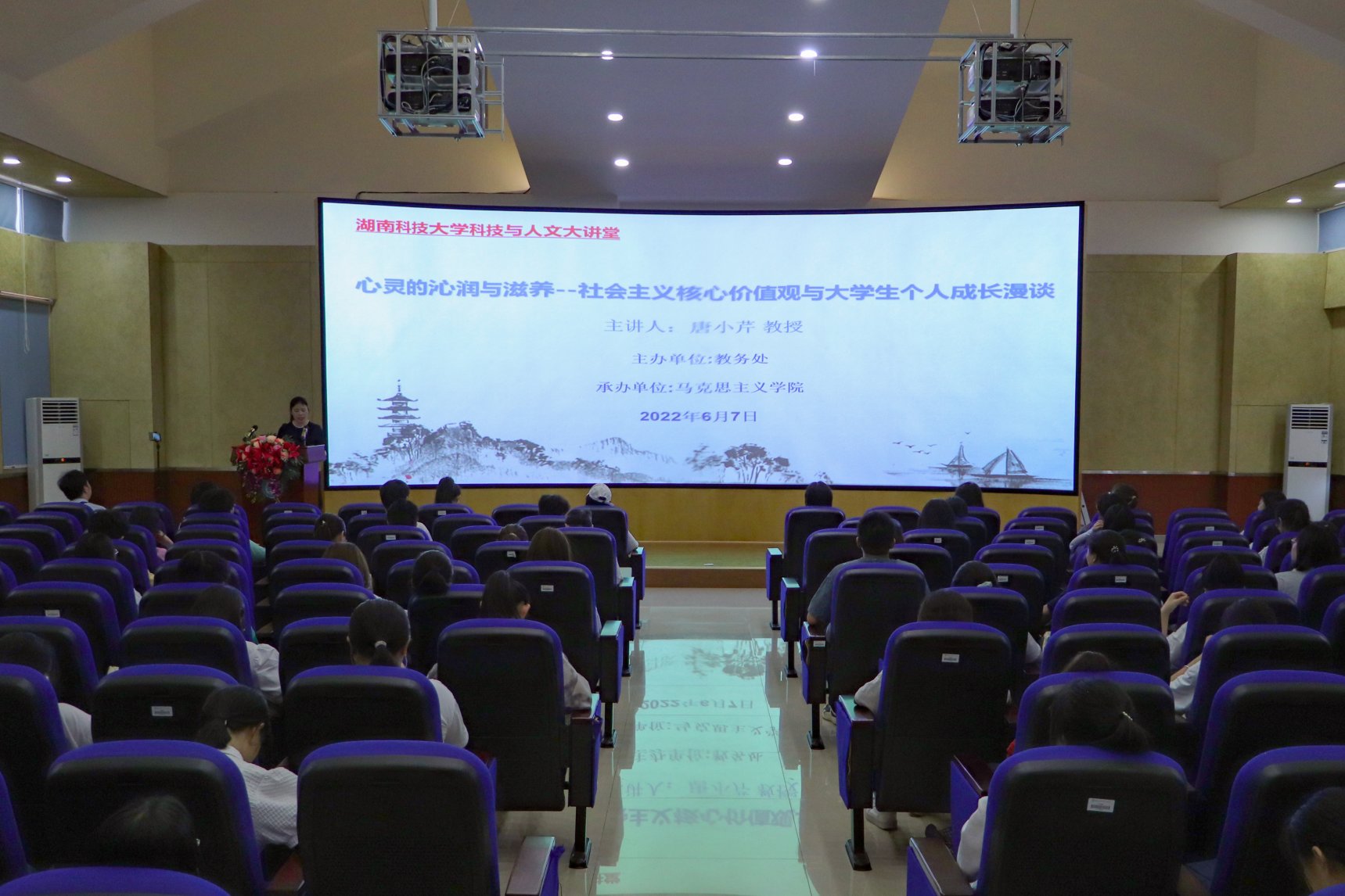 为营造浓厚的校园学术氛围,进一步增强大学生创新意识,激发大学生学习兴趣,开阔大学生学术视野,完善课堂教学理论知识体系,推进学校创新型应用人才培养全面转型,6月7日下午,我校“科技与人文大讲堂”在立志楼B5-2报告厅精彩开讲。本次活动由教务处主办,永利yl23411承办,主题为“心灵的沁润与滋养——社会主义核心价值观与大学生个人成长漫谈”,由永利yl23411唐小芹教授主讲。报告会由永利yl23411副院长黄爱英主持,教务处、永利yl23411相关负责人,永利yl23411师生参加了本次活动。