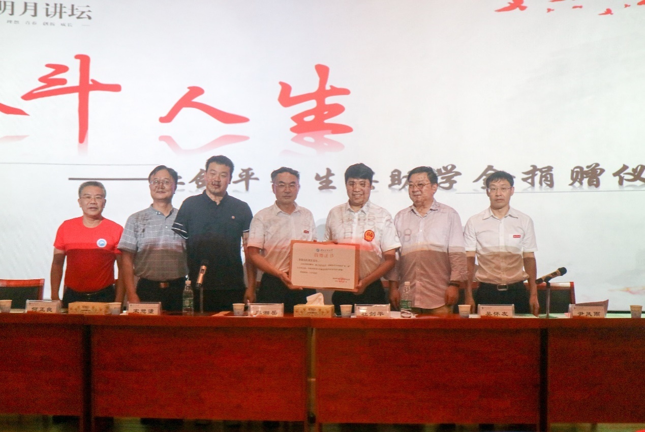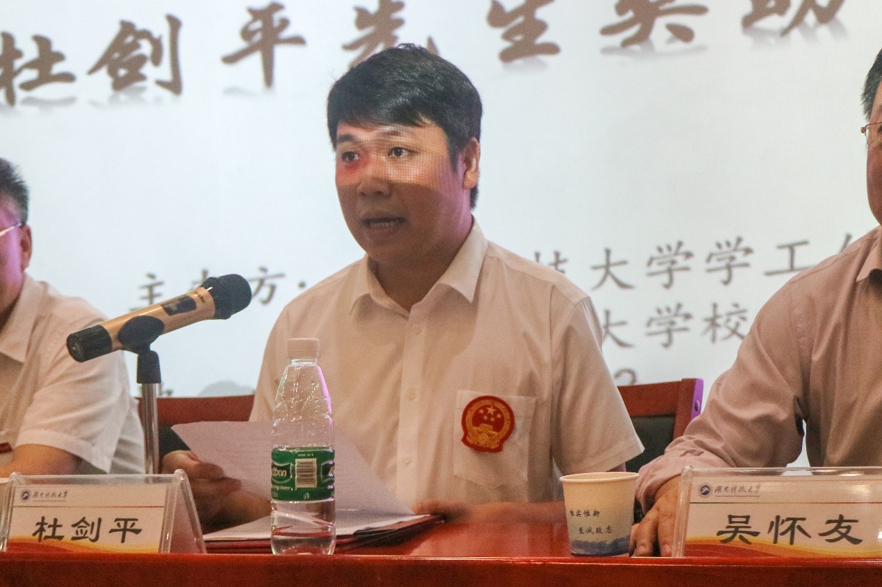 为弘扬奥运精神,激励我校学生的拼搏奋斗精神,6月4日下午,“明月讲坛:奋斗人生——残奥会游泳冠军个人事迹报告会暨捐赠仪式”在立志楼B5-2会议室举行。会议由湖南科技大学学工处(部)、湖南科技大学校友会主办,我院学生家长暨残奥会冠军杜剑平和宋懋璗出席主讲,湖南科技大学副校长廖湘岳、学工处处长尹风雨、永利yl23411院长吴怀友、党委副书记莫江平及体育学院、潇湘学院等领导出席了此次会议。