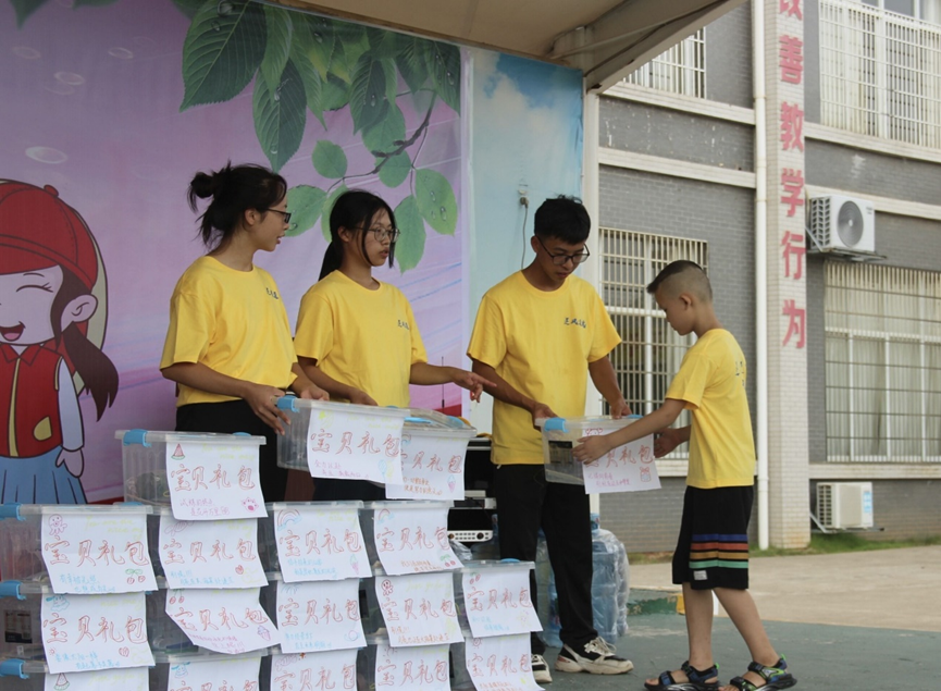 ▲赵良发同学为留守儿童发放爱心礼包