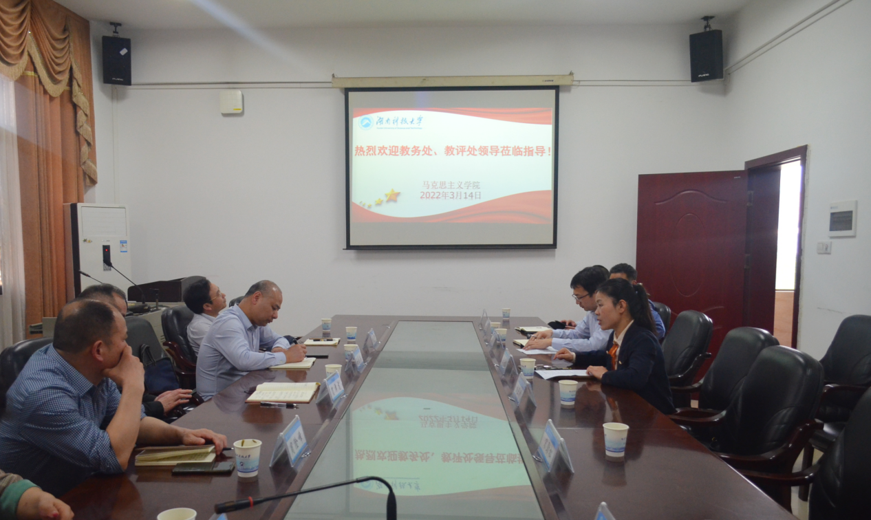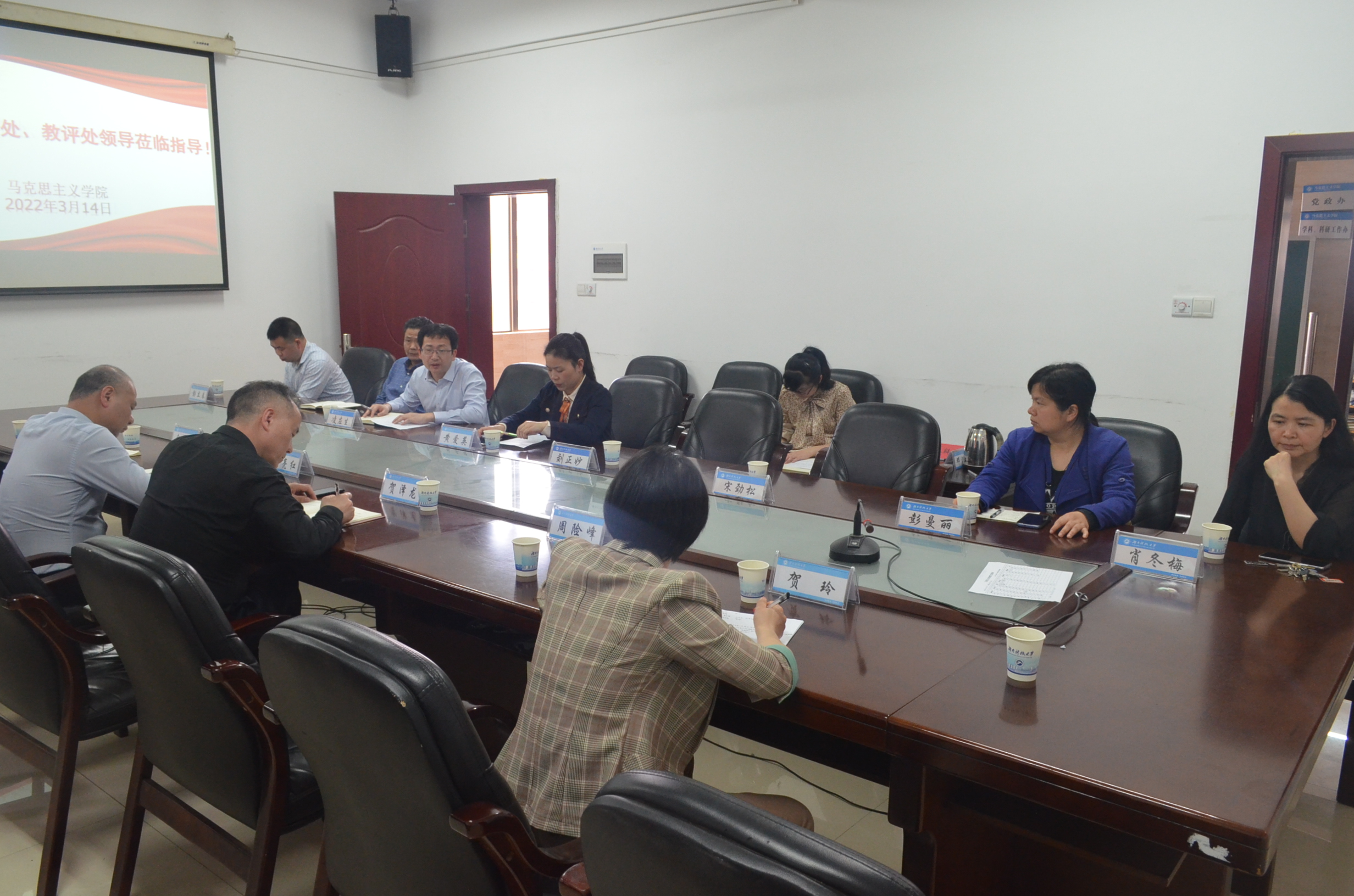 3月14日下午,我校副校长贺泽龙、教务处处长吴亮红、副处长余光辉、贺玲、评建办主任周险峰莅临我院进行教学督导与评估工作,并于立言楼A529召开指导会议。我院党委书记刘正妙、副院长黄爱英、副院长宋劲松、各系部主任凌应生、彭曼丽、肖冬梅、彭立春、吕开武等出席会议。