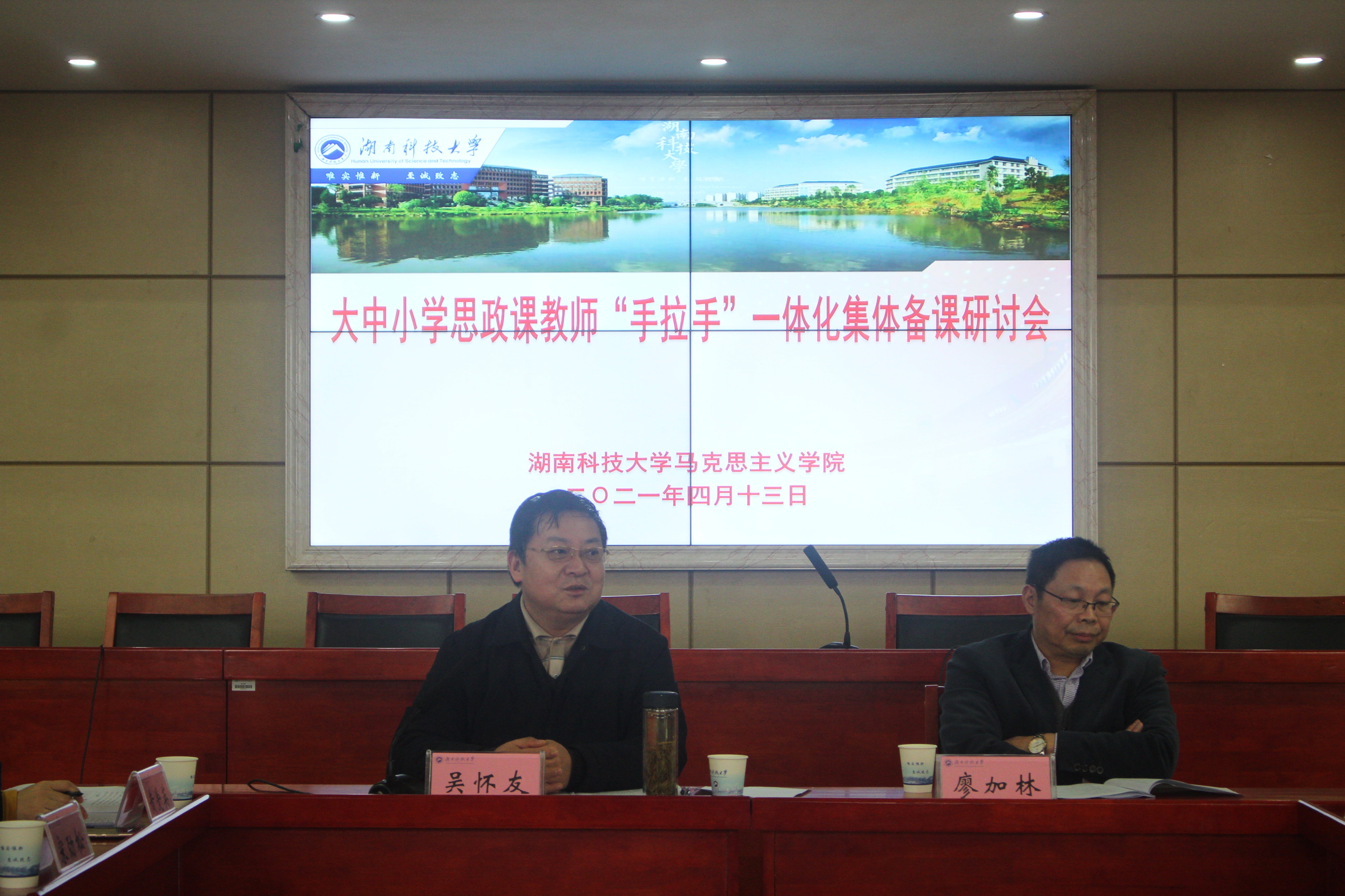 为深入贯彻落实习近平总书记关于教育的重要论述特别是在学校思想政治理论课教师座谈会上的重要讲话精神,贯彻落实中共中央办公厅、国务院办公厅《关于深化新时代学校思想政治理论课改革创新的若干意见》和教育部办公厅《深化新时代学校思想政治理论课改革创新先行试点工作方案》,根据《关于开展大中小学思想政治理论课“手拉手”一体化集体备课试点工作的通知》(湘教通〔2020〕281号)要求,我校作为试点高校之一,在湘潭地区深入开展大中小学思政课教师“手拉手”一体化集体备课试点工作。