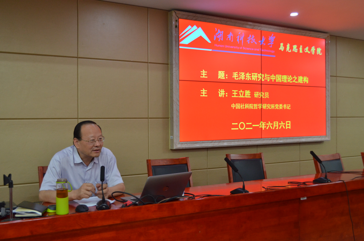 为推动学院党史学习教育高质量发展,特邀中国社科院哲学所党委书记王立胜研究员于2021年6月6日上午到学院作党史学习教育学术报告。报告会在立言楼学术报告厅5-1举行,报告的主题是“毛泽东研究与中国理论之建构”。报告由院长吴怀友教授主持,学院部分教师和研究生到场聆听。
