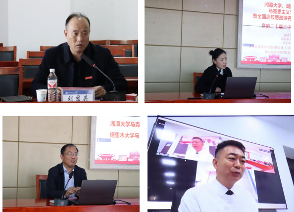 湘潭大学邓琴林博士以《二十届三中全会融入概论课的三重维度》为题从学理的高度深刻讲述了基于立场维度、组织维度和改革维度将党的二十届三中全会内容与概论课教学相融合的深度思考,彰显了新时代思政课教师既重教学、又重科研的教研原则。湖南科技大学张丽博士以《毛泽东思想活的灵魂——独立自主》为题将全会精神融入思政课进行教学展示,从探源、寻因、论今三个角度从“是什么、为什么、怎么做”的逻辑生动讲解了毛泽东思想活的灵魂之独立自主的科学内涵、重大意义及其时代彰显,体现了新时代思政课教师既重理性思考、又重感性熏陶的教改思维。塔里木大学王玉玲老师以《二十届三中全会精神融入邓小平理论的教学思考》为题从“为何融、怎么融、融什么”三个方面分析全会内容与教材的对比点、找准教材与全会精神的融入点,进而讲好改革开放的理论逻辑、历史逻辑和实践逻辑,以及现代化、中国式的现代化与中国式现代化的关系。湖南科技大学韩平副教授、塔里木大学朱瑞海教授、湘潭大学李雅兴教授分别对三位青年教师的分享做了精彩点评,一致认为三位青年教师深刻领悟了进一步全面深化改革的重要性、深入阐释了全会内容融入思政课的契合点、深度把握了贯彻落实全会精神的落脚点。