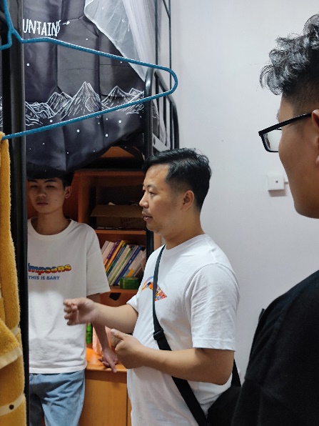 在昭潭书院,刘图其副书记到每个寝室看望了学生。没到一个寝室,都要询问同学们五一返校情况以及身体状况,并多次提醒、强调,同学们多注意开窗通风、保持寝室干净整洁。