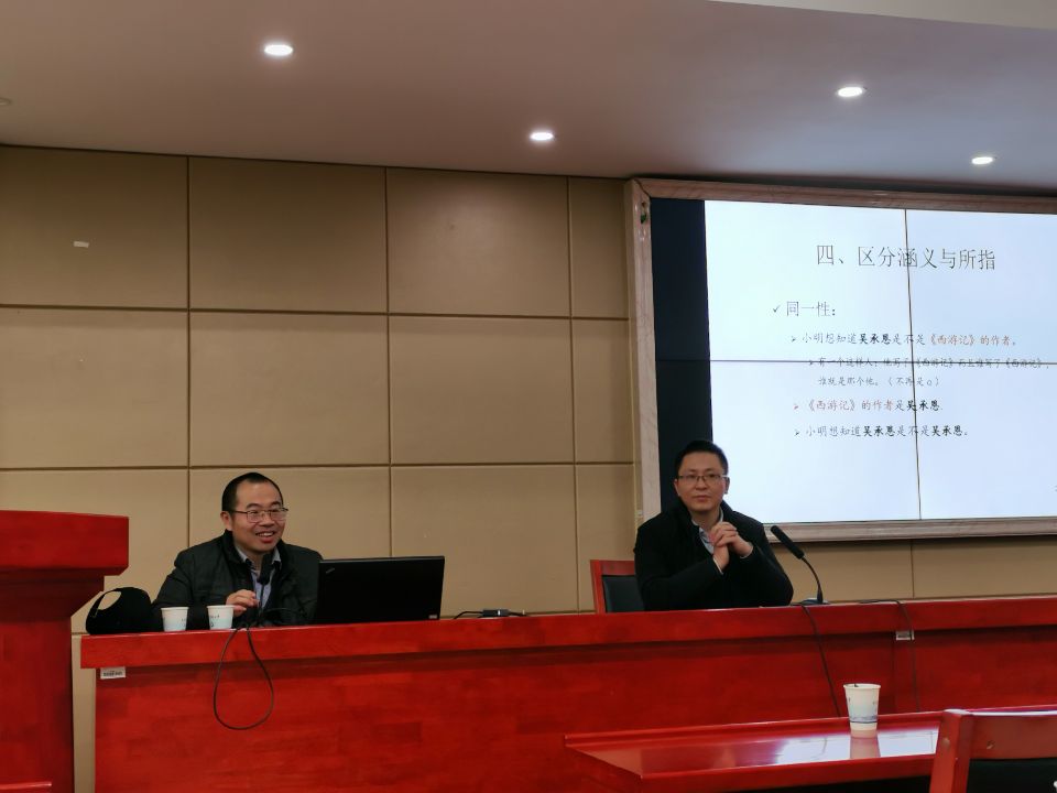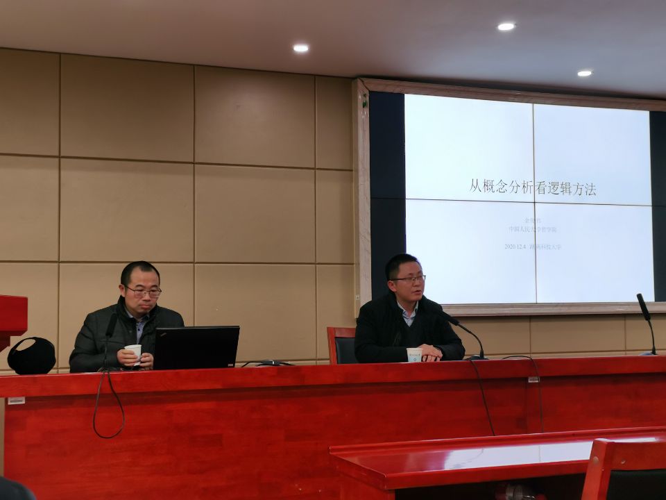 2020年12月4日晚7点30分,中国人民大学哲学学院教授、博士生导师、逻辑学教研室主任、中国逻辑学会常务理事余俊伟教授应邀在立言楼A5-1作题为“从概念分析看逻辑方法”的学术报告。此次报告由我院哲学硕士点负责人颜中军副教授主持,张晚林教授、龚超博士、焦自军博士等专业教师,哲学专业全体研究生、马克思主义理论专业部分研究生、思政专业部分本科生到场聆听。
