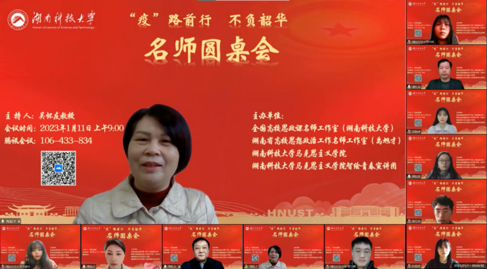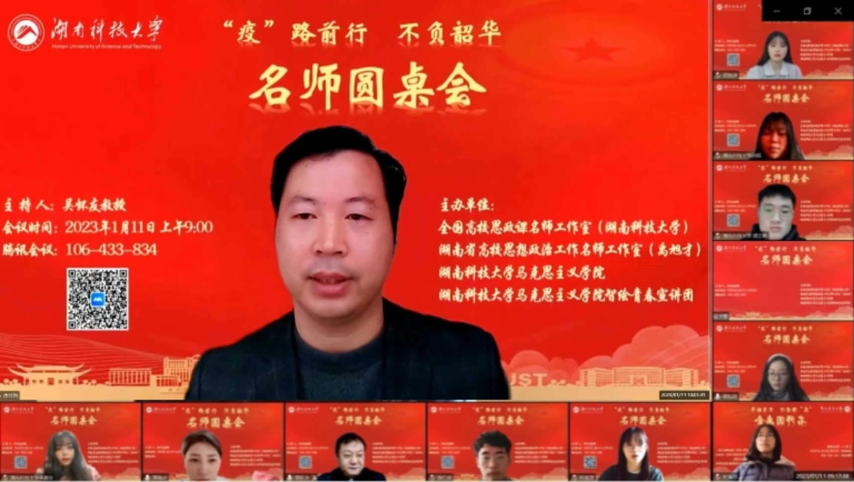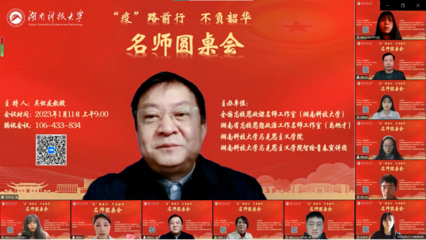 为进一步推动思政课教师下沉学生,形成老师关心学生、关爱学生、回应学生困惑的良好氛围,以提升思政课教学的针对性和实效性,1月11日上午,全国高校思政课名师工作室(湖南科技大学)、湖南省高校思想政治工作名师工作室(禹旭才)、永利yl23411及智绘青春宣讲团通过腾讯会议平台联合举办了以“‘疫’路前行、不负韶华”为主题的名师圆桌会。本次圆桌会由全国高校思政课名师工作室(湖南科技大学)负责人吴怀友教授主持,名师工作室核心成员、永利yl23411和江西师范大学永利yl23411部分师生共70余人参加会议。