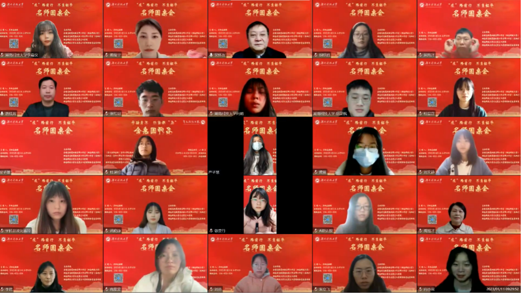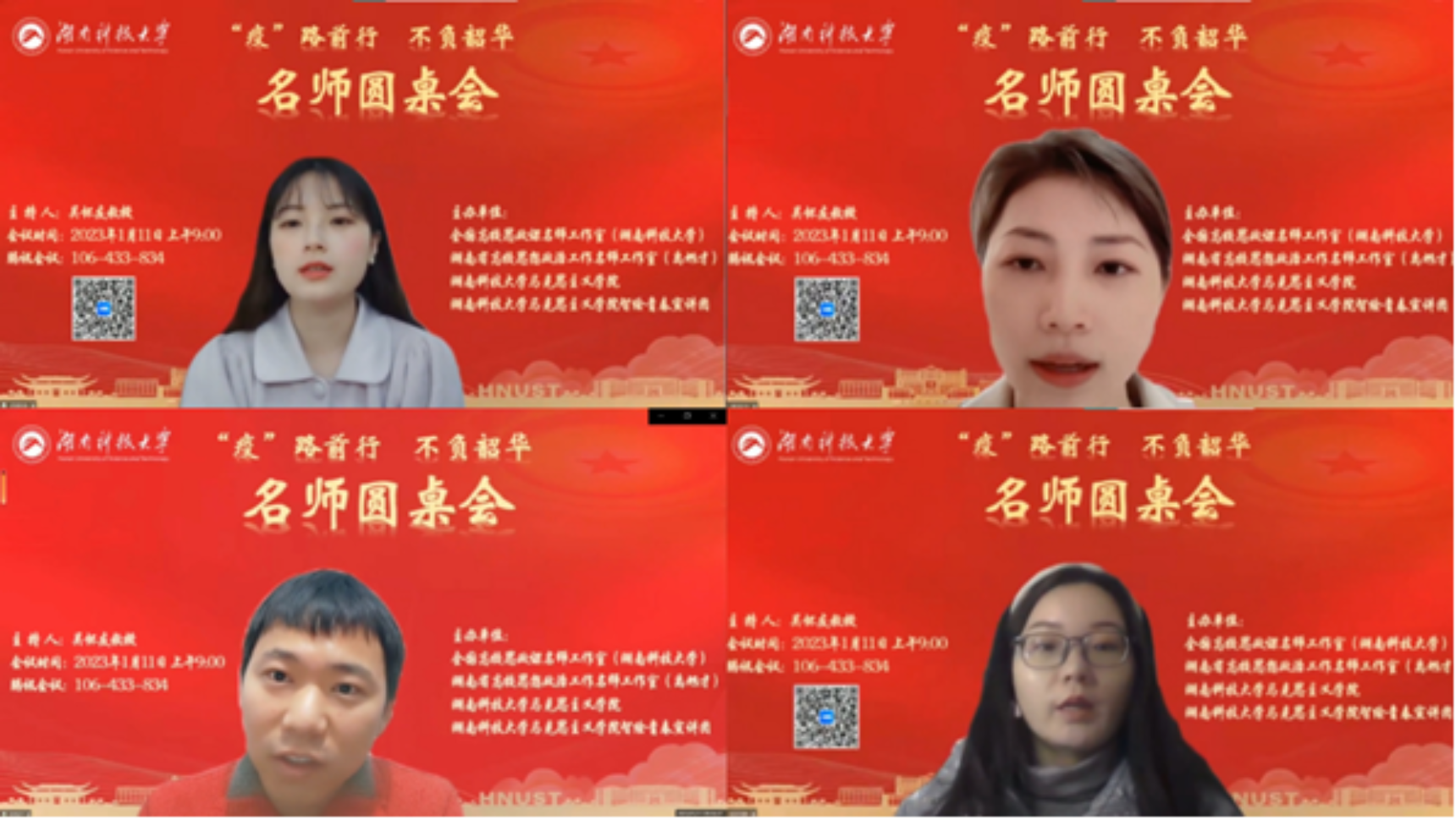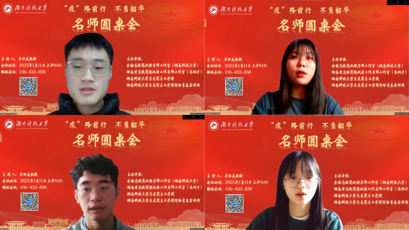 为进一步推动思政课教师下沉学生,形成老师关心学生、关爱学生、回应学生困惑的良好氛围,以提升思政课教学的针对性和实效性,1月11日上午,全国高校思政课名师工作室(湖南科技大学)、湖南省高校思想政治工作名师工作室(禹旭才)、永利yl23411及智绘青春宣讲团通过腾讯会议平台联合举办了以“‘疫’路前行、不负韶华”为主题的名师圆桌会。本次圆桌会由全国高校思政课名师工作室(湖南科技大学)负责人吴怀友教授主持,名师工作室核心成员、永利yl23411和江西师范大学永利yl23411部分师生共70余人参加会议。