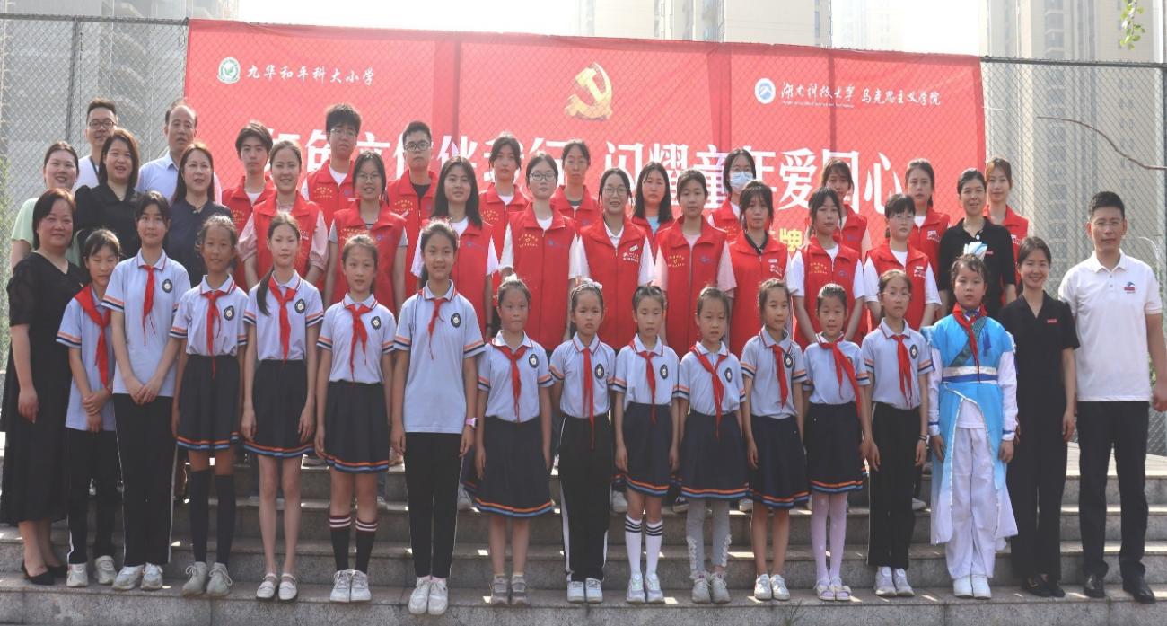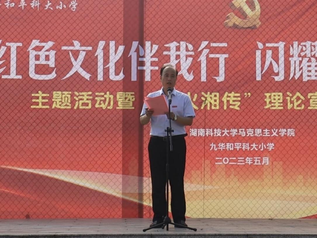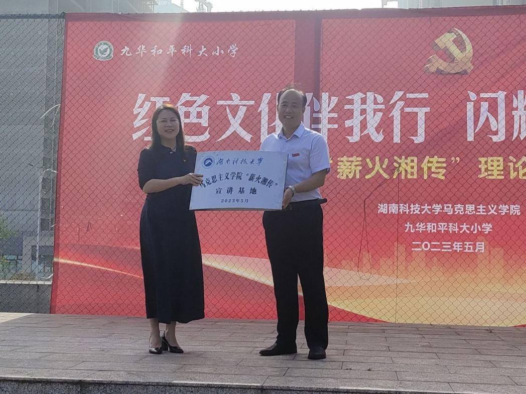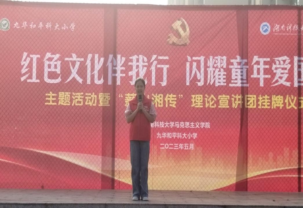 5月29日上午,永利yl23411“薪火湘传”理论宣讲团与九华和平科大小学共同举行“红色文化伴我行,闪耀童年爱国心”主题宣讲活动暨“薪火湘传”理论宣讲团九华和平科大小学基地挂牌仪式。出席本次活动的有永利yl23411党委副书记刘图其、“薪火湘传”宣讲团指导老师钟声副教授、学工办主任刘哲、辅导员罗娜老师、“薪火湘传”宣讲团成员20余人、九华和平科大小学李莉校长、九华和平科大小学三千余名师生。