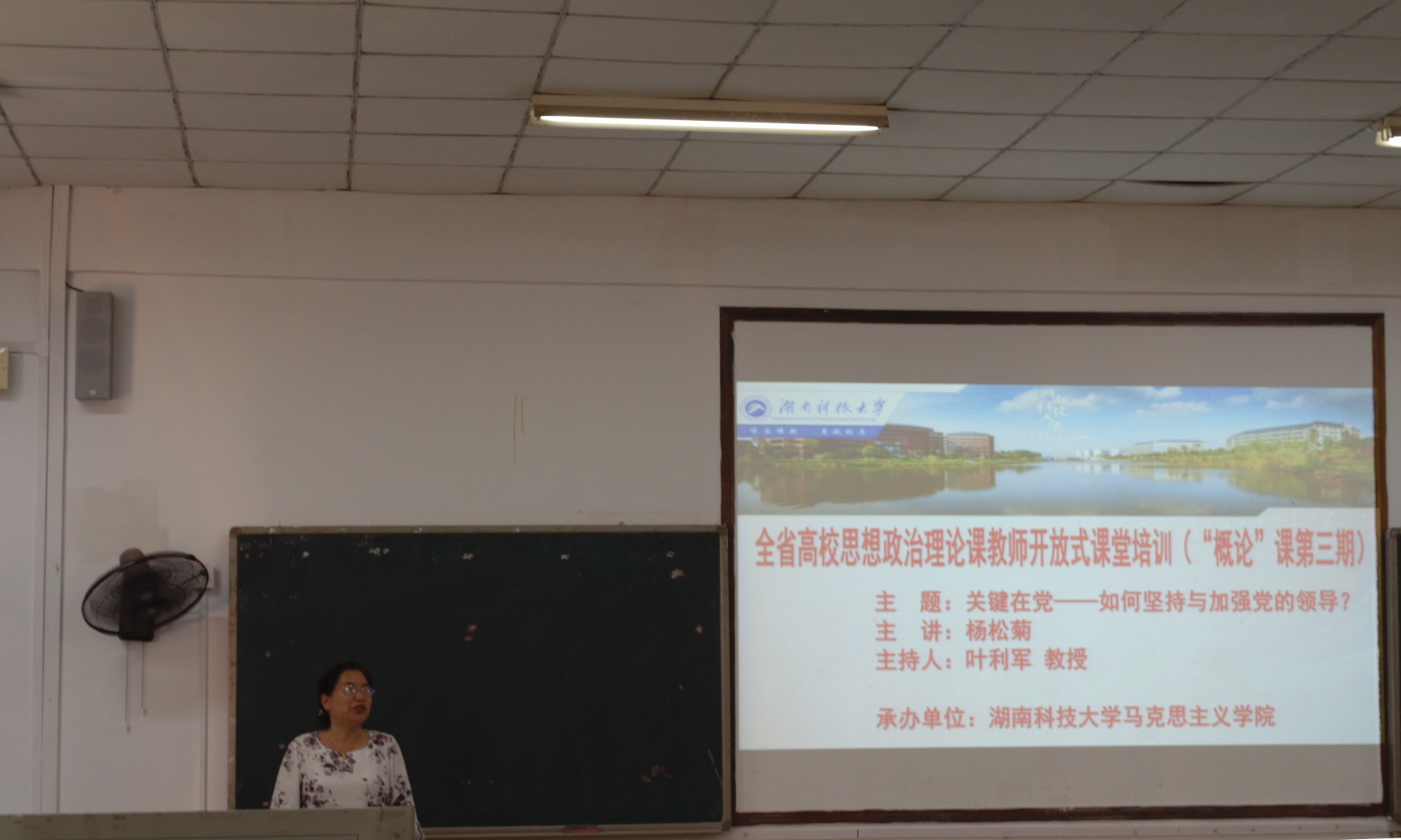 5月14日下午,湖南省教育厅和湖南省委教育工委组织的《毛泽东思想和中国特色社会主义理论体系概论》课开放式课堂培训活动在我校第八教学楼1-3教室举行。永利yl23411杨松菊教授担任本期主讲教师,湖南省思想政治理论课教指委专家叶利军教授主持活动。全省100余所高校120多名思政课教师、永利yl23411全体思政课教师参与现场听课和交流研讨。