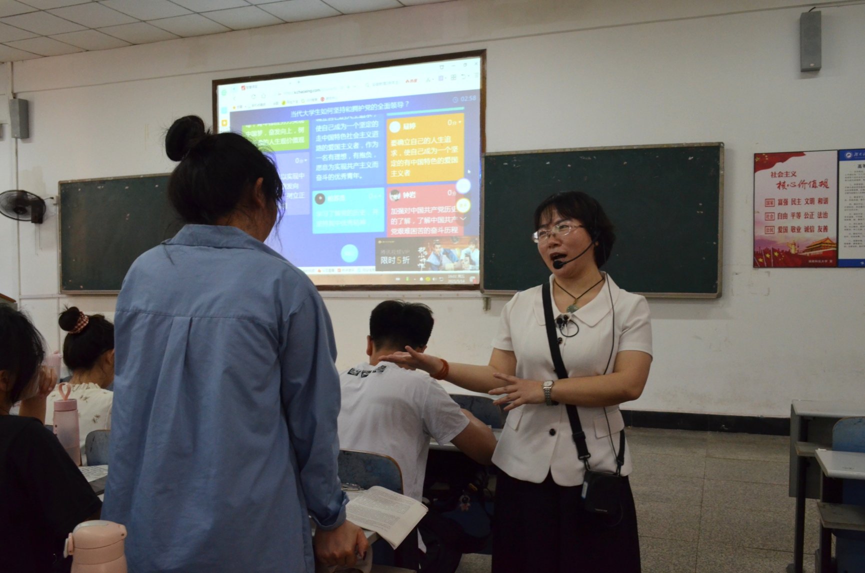 杨松菊教授授课的主题是《关键在党——如何坚持和加强党的全面领导?》。她以《中国共产党的百年述职报告》视频进行教学导入,积极引导学生去探寻中国共产党取得百年辉煌历史成就的原因,紧接着层层递进、环环相扣,深刻论述党的全面领导就是党对一切工作的领导、坚持和加强党的全面领导的三大逻辑、确保党的全面领导落到实处这三个问题。杨松菊教授以深厚的理论功底,从历史的选择、人民的选择以及中国共产党自身的优势三个角度,对为什么要坚持和加强中国共产党的全面领导进行深入分析,积极引导学生深刻理解中国共产党为什么“能”的道理。在教学方式上,杨松菊教授坚持课堂教学与多媒体技术深度融合,充分运用超星学习通平台进行授课,并使用学习通平台与学生展开主题讨论,有效进行互动交流,启发学生运用马克思主义立场观点方法分析和解决问题。学生们一致认为在课堂上有很强的获得感,对为什么要坚持和加强党的全面领导、如何做到坚持和拥护党的全面领导有了更深刻的掌握。