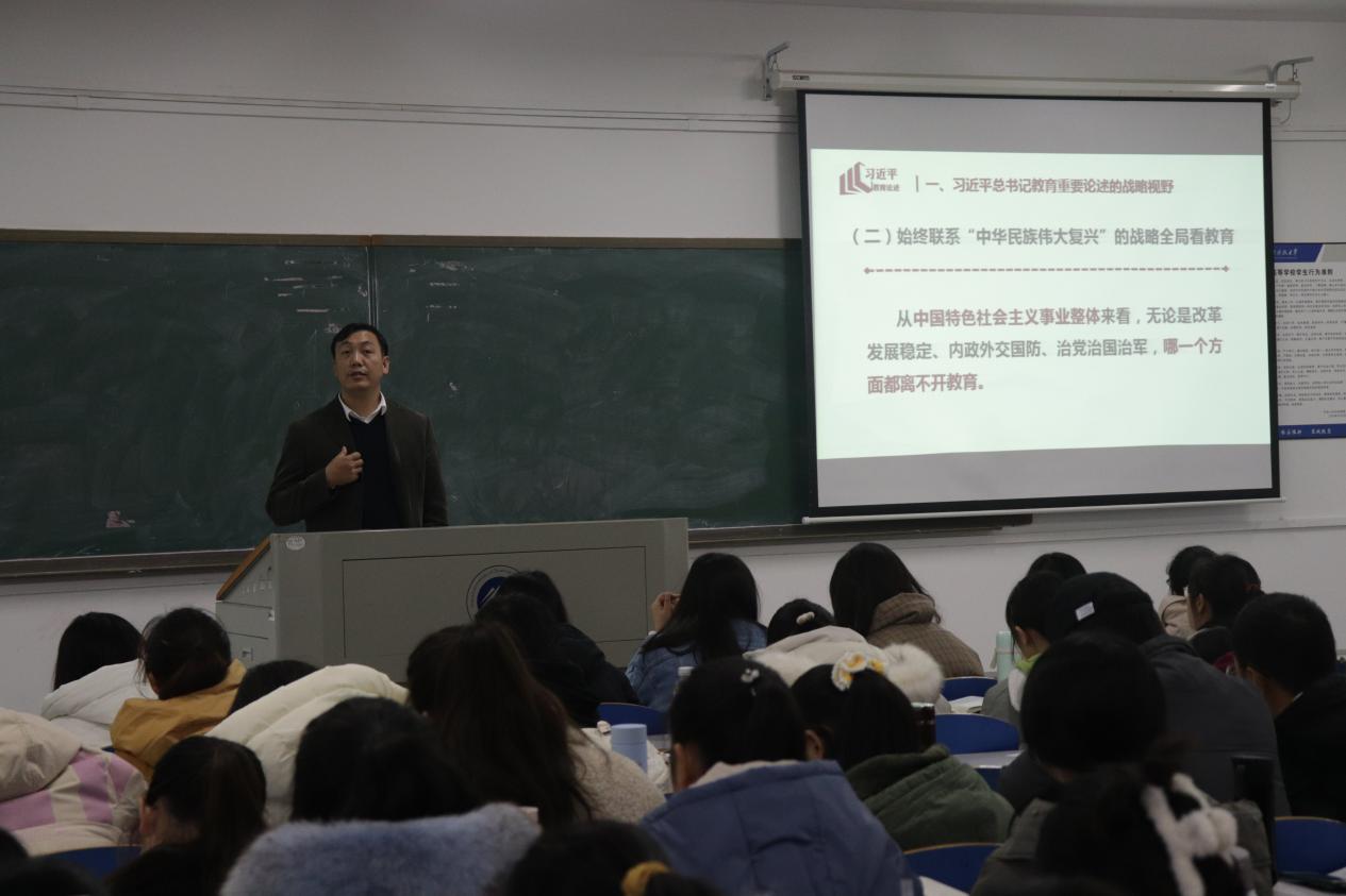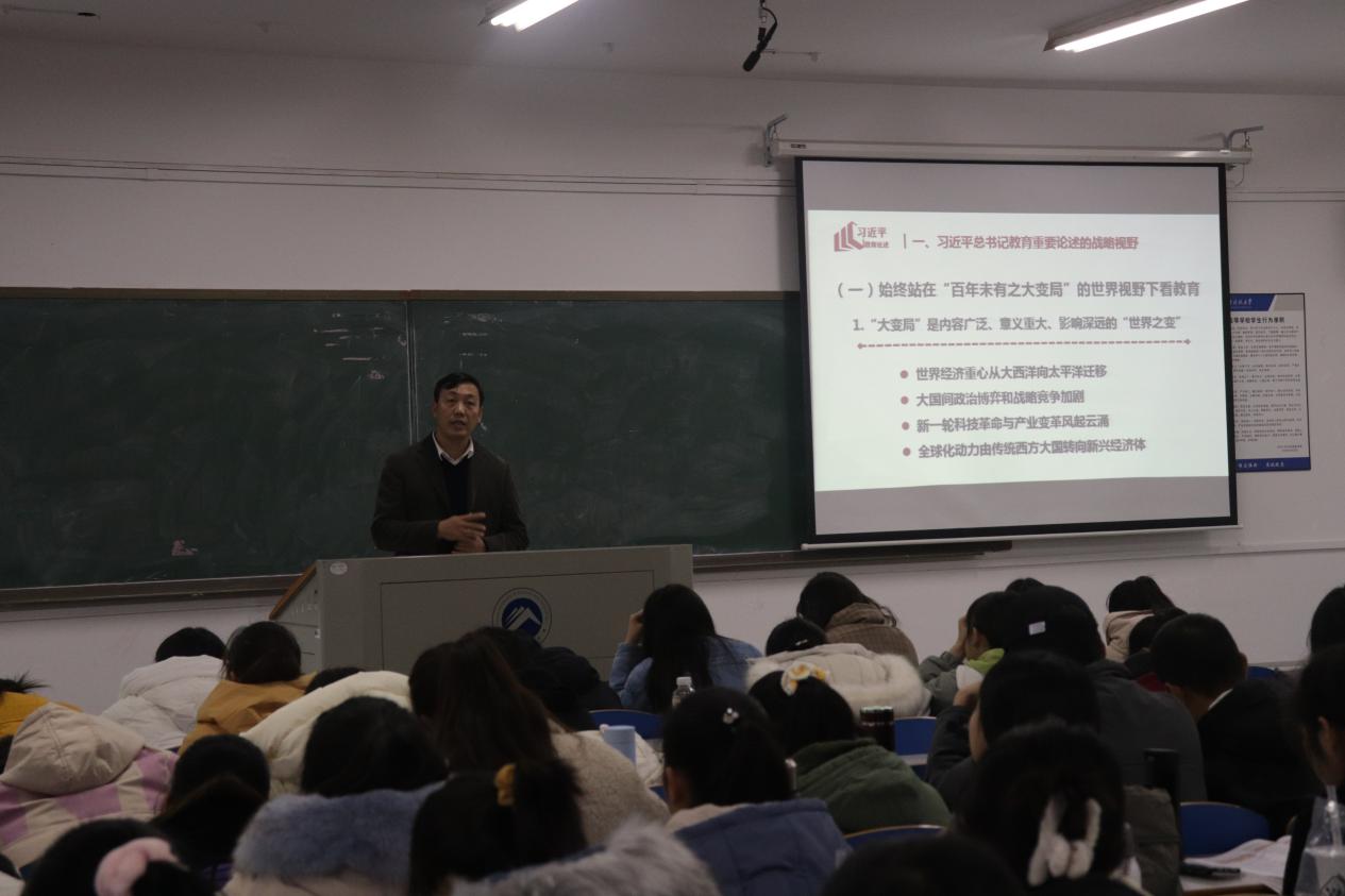 刘书记主要围绕“深入学习理解习近平总书记教育重要论述”的主题展开,以《习近平总书记教育重要论述讲义》一书为引,首先向同学们介绍了在党的十八大以来,习近平总书记立足世界发展大势和国家发展全局,着眼民族复兴伟大梦想,围绕中国教育发展作出了一系列重要讲话,形成了习近平总书记关于教育的重要论述。从习近平总书记教育重要论述的战略视野出发,刘书记强调了教育的重要性,只有当今的学生接受了正确的教育和观念体系,才能实现国家的长续性发展。他举了香港问题这一例子,由于香港政府没有牢牢掌握教育意识形态话语权,导致香港人民的意识形态和文化方面出了问题,有力论证了教育是国之大计、党之大计。