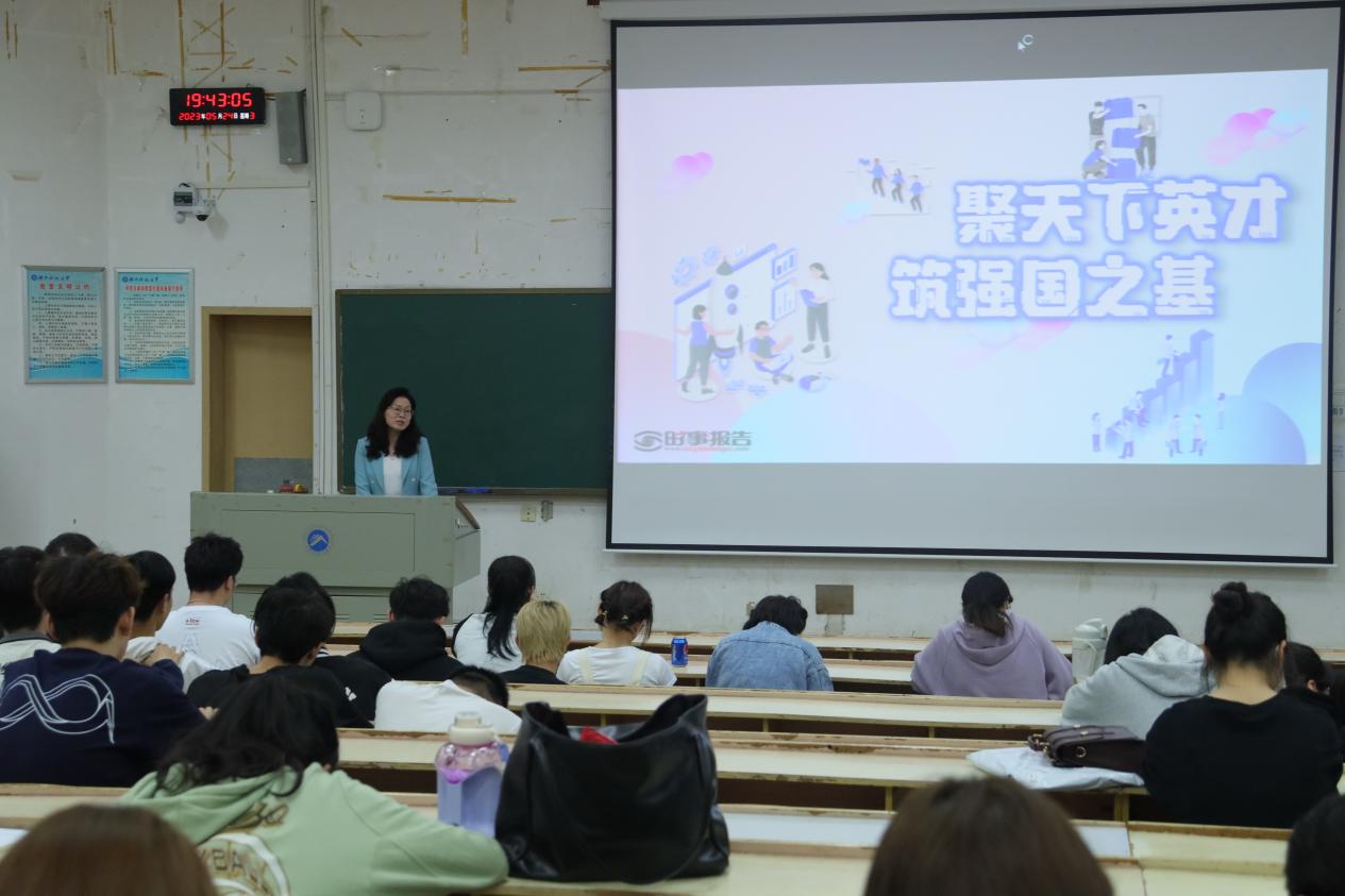 2023年5月24日第九、十节课,校党委委员、副校长谢慧在第五教学楼1-3教室以“聚天下英才,筑强国之基”为主题,给21财管、会计、土木共6个班的同学们讲授了“形势与政策”课。