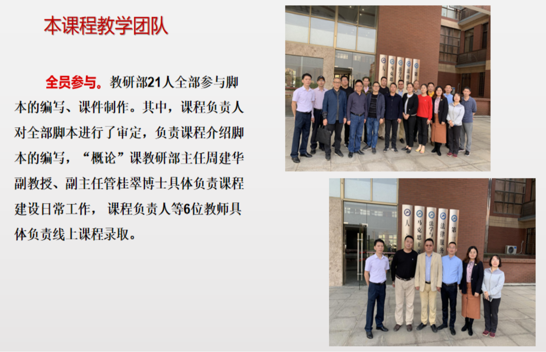 在“概论”课线上课程的制作中,概论课教研部21人全部参与脚本的编写、课件制作。其中,课程负责人对全部脚本进行了审定,负责课程介绍脚本的编写,“概论”课教研部主任周建华副教授、副主任管桂翠博士具体负责课程建设日常工作,课程负责人等6位教师具体负责线上课程录制。课程团队中有教授4人、副教授7人、讲师10人,博士17人、硕士4人。团队成员主持过教育部哲学社会科学重大课题攻关项目1项、国家社科基金项目7项,主持教育部、中宣部项目9向,主持省社科基金重大专项1项,多人次获得省级、校级教学竞赛、“示范课堂”“优秀教案”“优秀课件”“数字化教学资源”奖项。