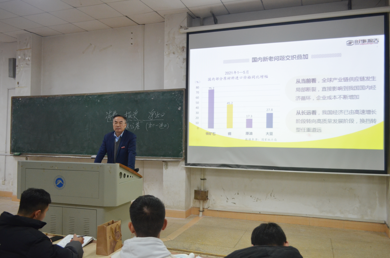 廖湘岳副校长以我国经济发展现状为背景,从“稳中加固、渐回常态”,“坚定信心、韧性依旧”,“构新格局、赢高质量”三个方面展开讲课,不仅介绍了中国当前的经济情势,点明了我国经济发展面临的问题,更创造性地提出了经济持续发展对策。课堂伊始,廖湘岳副校长用三大产业增加值的图表说明了中国经济稳步发展,从疫情期间我国生产业的实际情况中点明了中国共产党集中力量办大事的独特优势。随后他向同学们提问:“中国伟大成就的两大奇迹是什么”,引发了大家的思考。不少同学积极举手回答,课堂氛围轻松活跃。对于我国当前面临的经济发展问题,他指出要发挥我国的制度优势,加强科技创新,坚定发展信念。廖湘岳副校长强调我国经济要深化供给侧结构性改革,畅通经济循环,构建发展新格局。