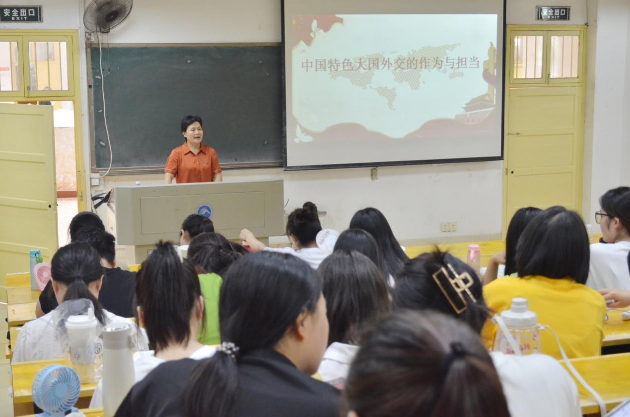 6月28日五六节课,副校长李琳于十教东附楼301教室给18级文学专业的学生上了一堂关于中国特色大国外交的作为与担当的“形势与政策”专题思政课。