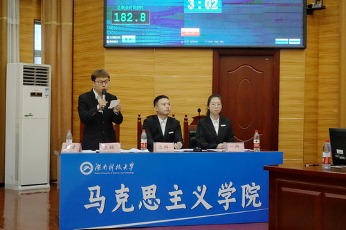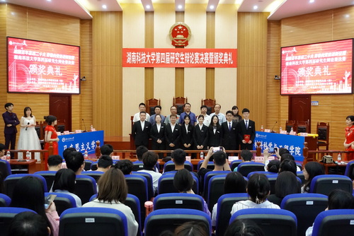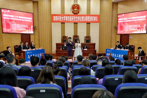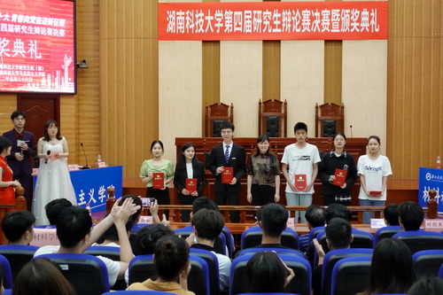 为了丰富研究生业余文化生活,以青春昂扬的精神面貌迎接党的二十大召开,增强广大青年学子的新时代使命感和责任感,5月26日下午,由湖南科技大学研究生院(部)主办,永利yl23411承办的“建团百年喜迎二十大 青春向党奋进新征程”第四届研究生辩论赛决赛暨颁奖典礼在立言楼A栋三楼模拟法庭成功举行。本次活动邀请了湖南科技大学党委宣传部副部长李友桥、人文学院教授张学知及校辩论队谢水胜、耿骄阳、杨素云担任评委,并邀请湖南科技大学研究生院院长李海萍、永利yl23411党委书记刘正妙、永利yl23411副院长宋劲松等担任颁奖嘉宾。此外,还有来自各学院的研究生代表到场观赛。