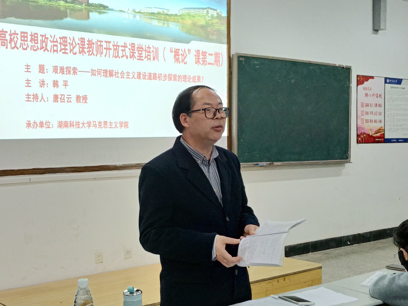 4月16日下午,湖南省教育厅和湖南省委教育工委组织的“毛泽东思想和中国特色社会主义理论体系概论”课开放式课堂培训在我校第八教学楼1-3教室举行。首届高校思想政治理论课教学展示活动二等奖获得者、永利yl23411韩平副教授担任本期主讲,湖南省思想政治理论课教指委专家唐召云教授担任本期交流研讨主持人。来自全省100余所高校的120余名思政课教师以及我校永利yl23411全体思政课教师参与现场听课和交流研讨。