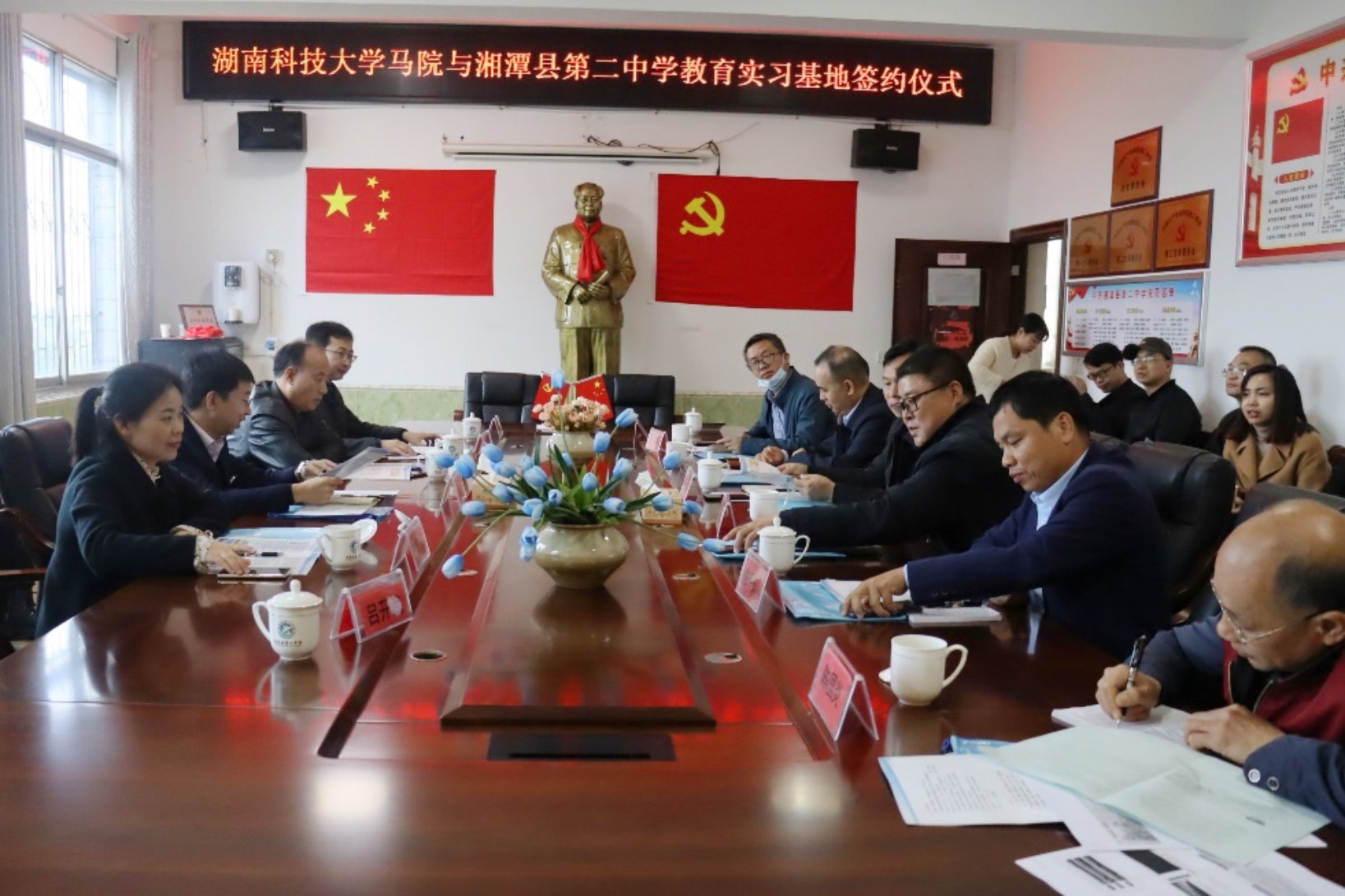 在签约仪式上,学院党委书记刘正妙与湘潭县二中校长文海石分别就双方单位情况做了详细介绍,同时,与会人员就相关合作事宜进行了深入交流。
