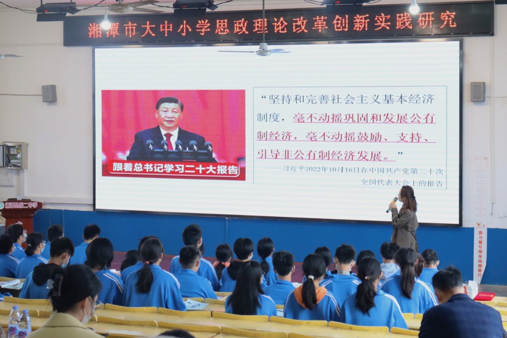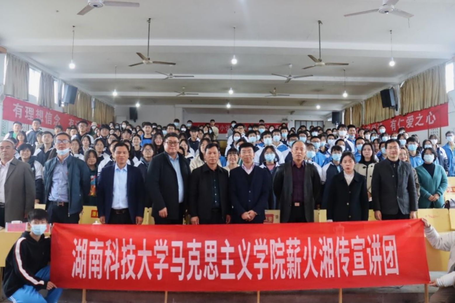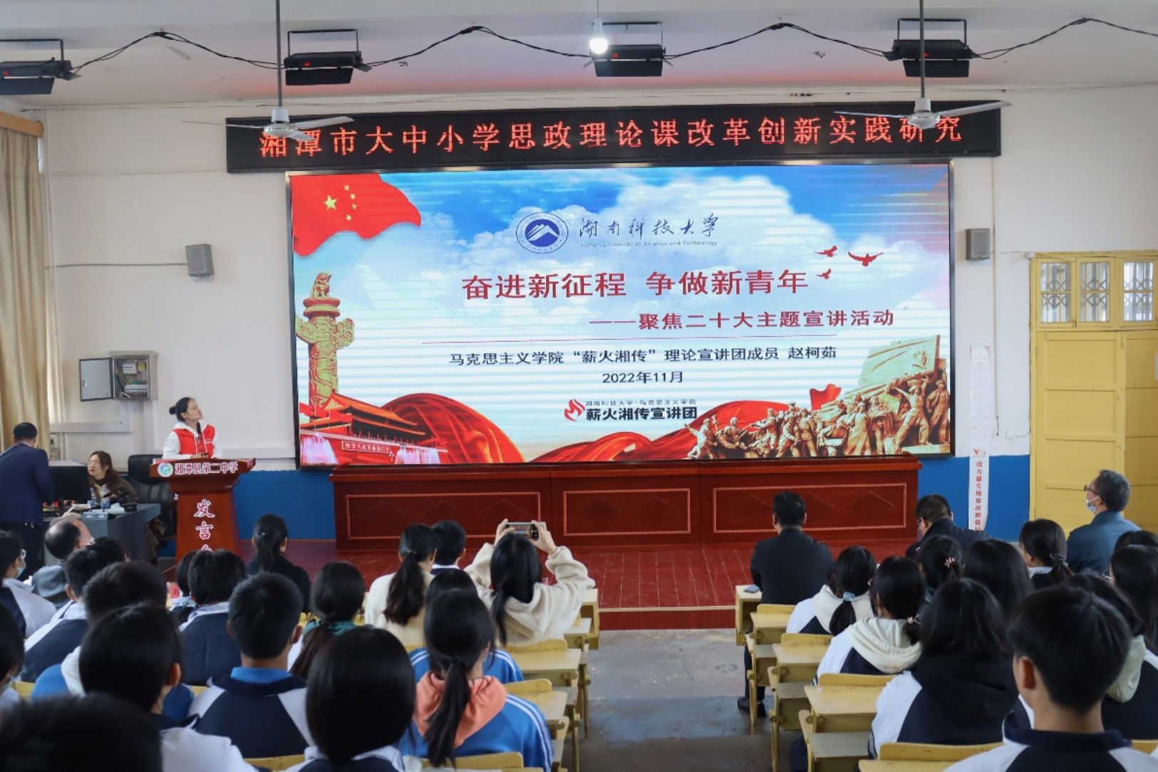 为进一步学习贯彻党的二十大精神,推动大中小学思想政治教育一体化建设,真正将立德树人根本任务落到实处,我院党委书记刘正妙、副书记刘图其、副院长黄爱英和思政系部分老师以及20级思政3、4班学生、部分“薪火湘传”理论宣讲团成员,一行70余人于11月24日到湘潭县二中开展了学生教育见习、教育实习和“薪火湘传”宣讲团宣讲基地签约授牌、湘潭市大中小学思政理论课改革创新实践研讨、党的二十大精神宣讲等一系列活动。