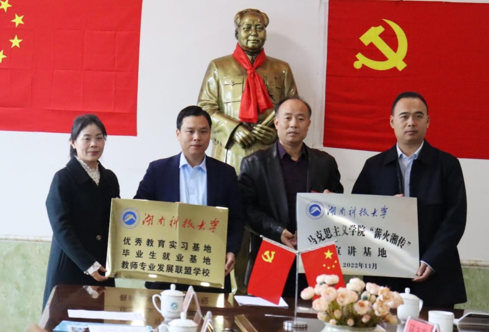 签约仪式完成后,刘图其、黄爱英分别将湖南科技大学优秀教育实习基地、湖南科技大学马克思主义“薪火湘传”宣讲团宣讲基地牌匾授予湘潭县二中副校长汤明宇、陈平安。