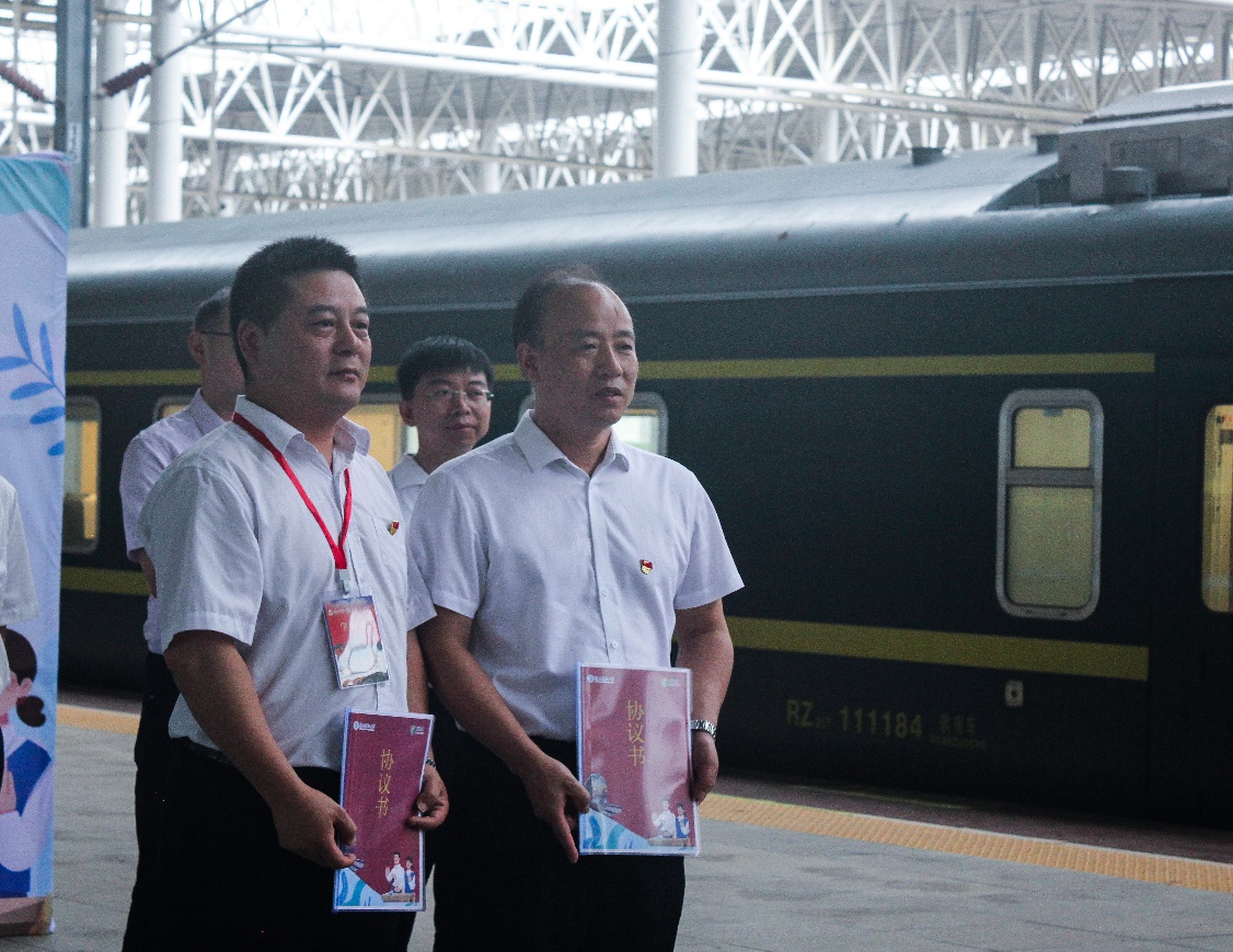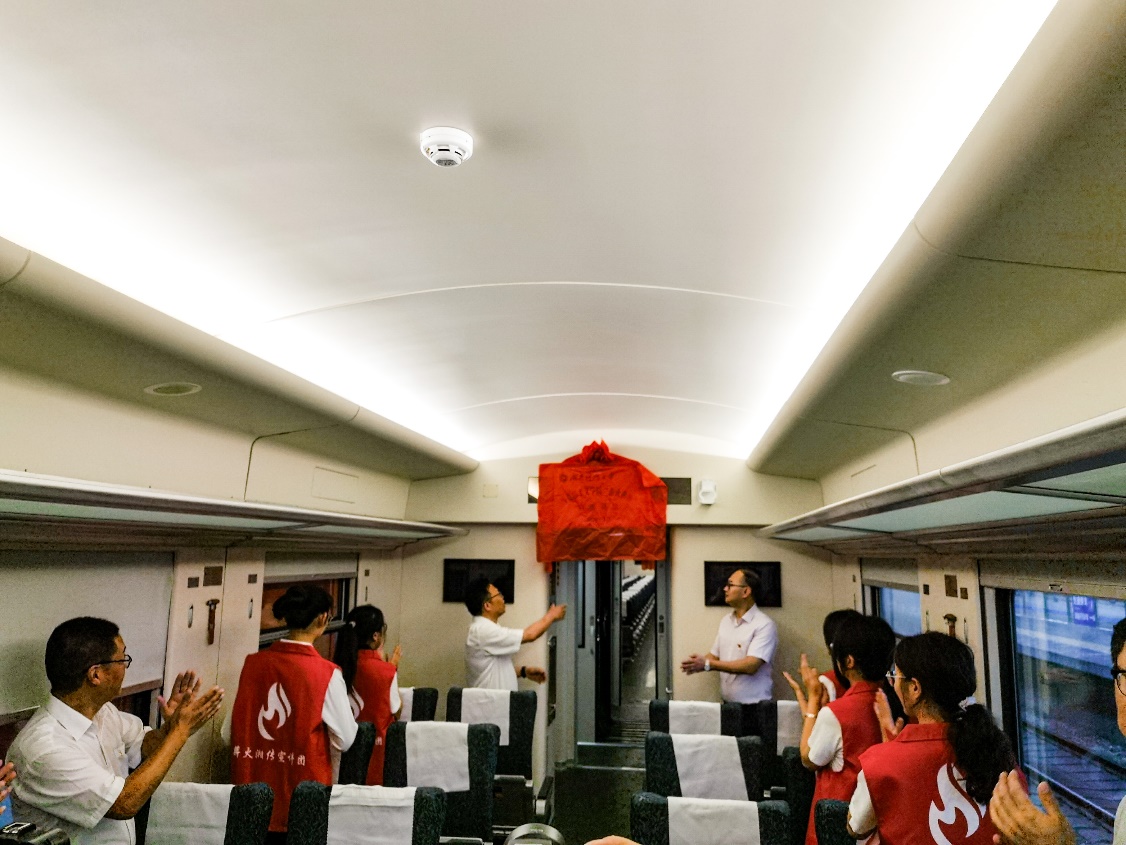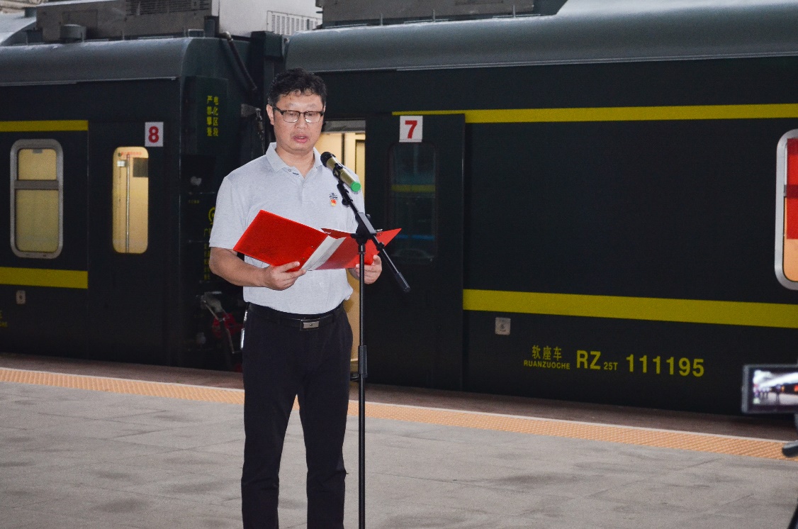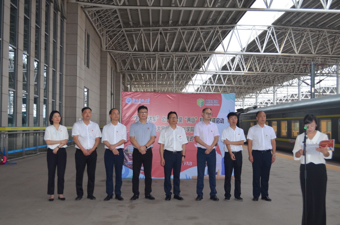 6月19日上午,校宣传部副部长李洪华、我院党委书记刘正妙、党委副书记刘图其、“薪火湘传”理论宣讲团指导老师及20余名宣讲团成员一行赴湘潭火车站,与湘潭城发集团党委副书记叶仕良、湘潭交发集团党委副书记裴道明、湘潭交发集团党委委员邓鸿君及湘潭城发集团党群工作部、湘潭红旅集团相关负责人员联合开展“薪火湘传”宣讲基地揭牌暨“两山”专列宣讲活动启动仪式。
