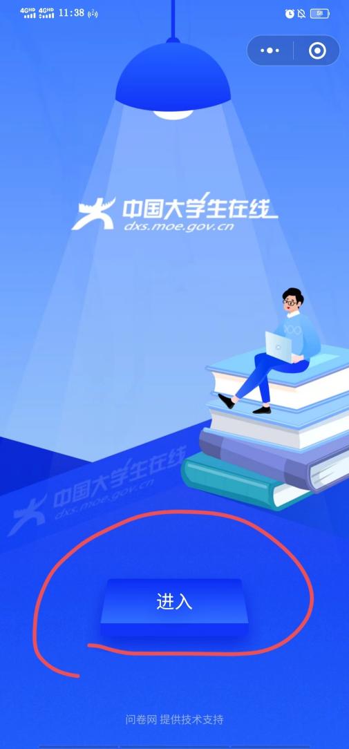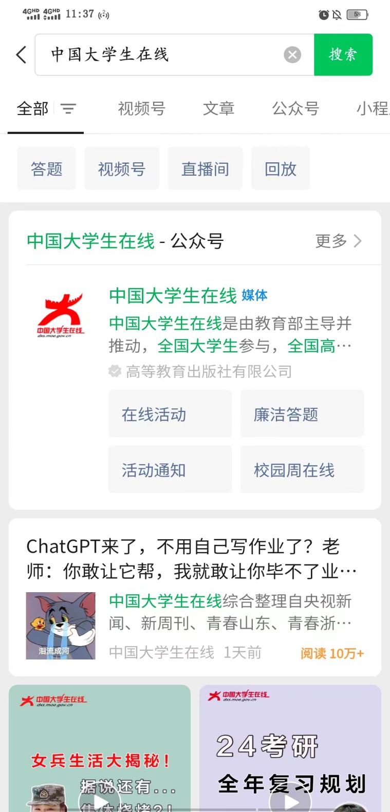 第一步,打开“微信”搜索框,搜索“中国大学生在线”,关注并进入对话框。