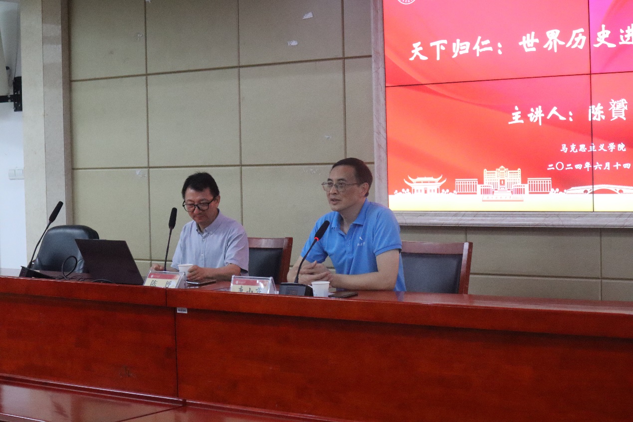 6月14日晚上,“湘江高端学术论坛”系列学术讲座在立言楼A5-1室进行。教育部人文社会科学重点研究基地华东师范大学中国现代思想文化研究所副所长、教育部长江学者特聘教授、浙江大学马一浮书院副院长陈贇教授应邀来我院作题为“天下归仁:世界历史进程的儒家叙事”的学术讲座。讲座由学院院长唐小芹教授主持。